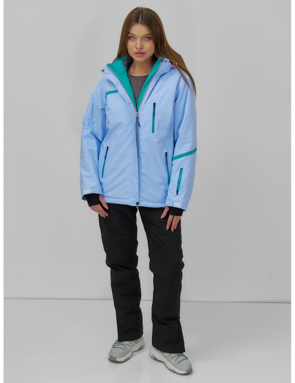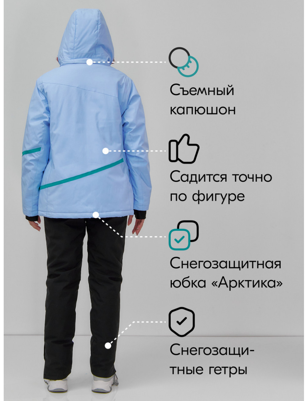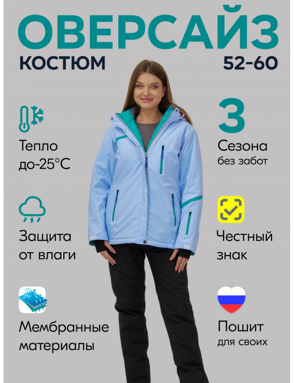 Сочетайте этот костюм с тёплыми термобельём и термоносками для максимального комфорта и защиты от холода. А стильный дизайн позволит вам не только покорять горные склоны, но и выделяться среди других любителей зимних видов спорта. Доставка по Москве и Московской области Женский горнолыжный костюм большого размера, голубой.