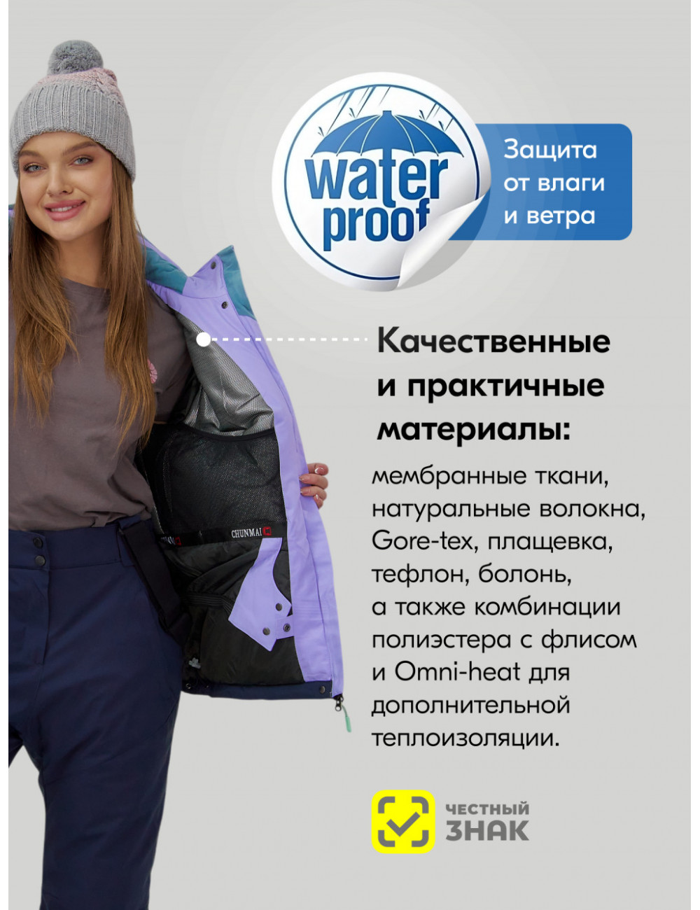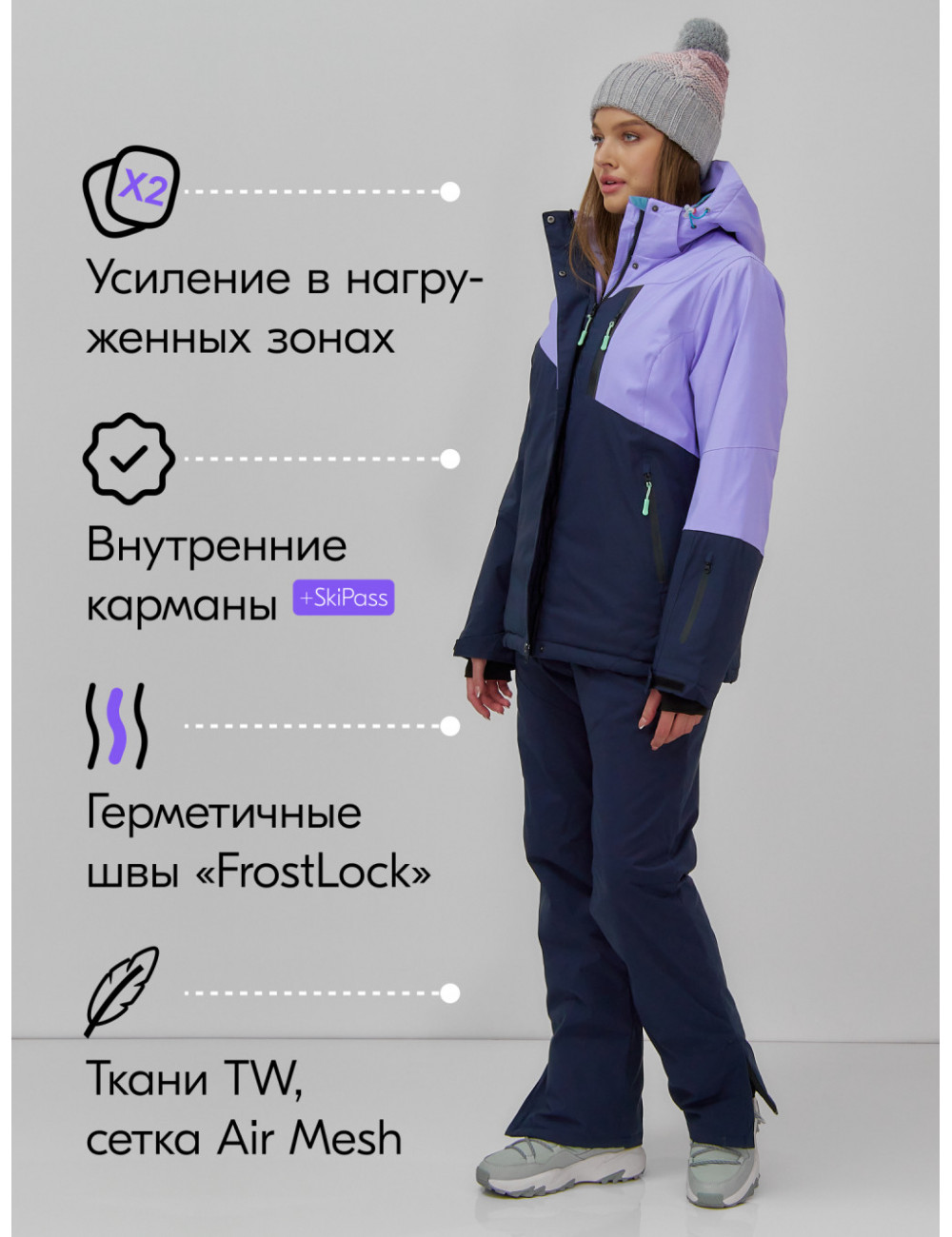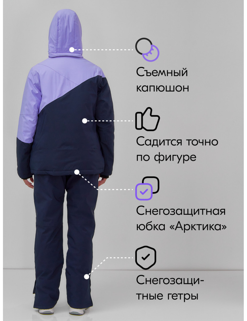 Костюм доступен в различных размерах, чтобы каждая женщина могла подобрать идеальный вариант. Доставка Женский горнолыжный костюм сиреневого цвета для зимы по Тюмени и Тюменской области СДЭК