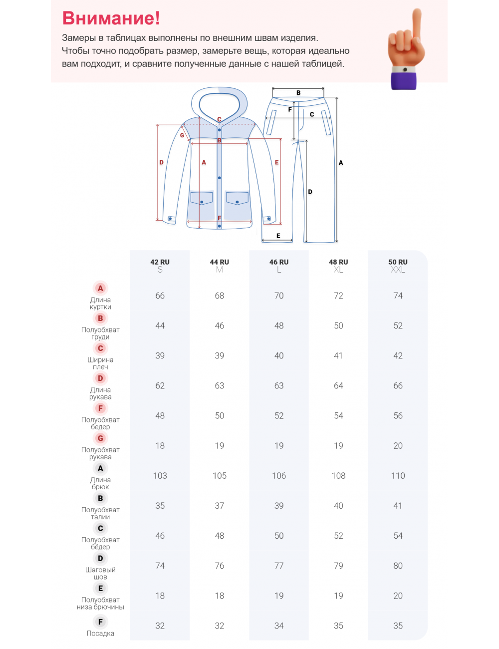 | Фиксаторы | По низу, На капюшоне, на рукавах, в поясе брюк, по низу брюк |