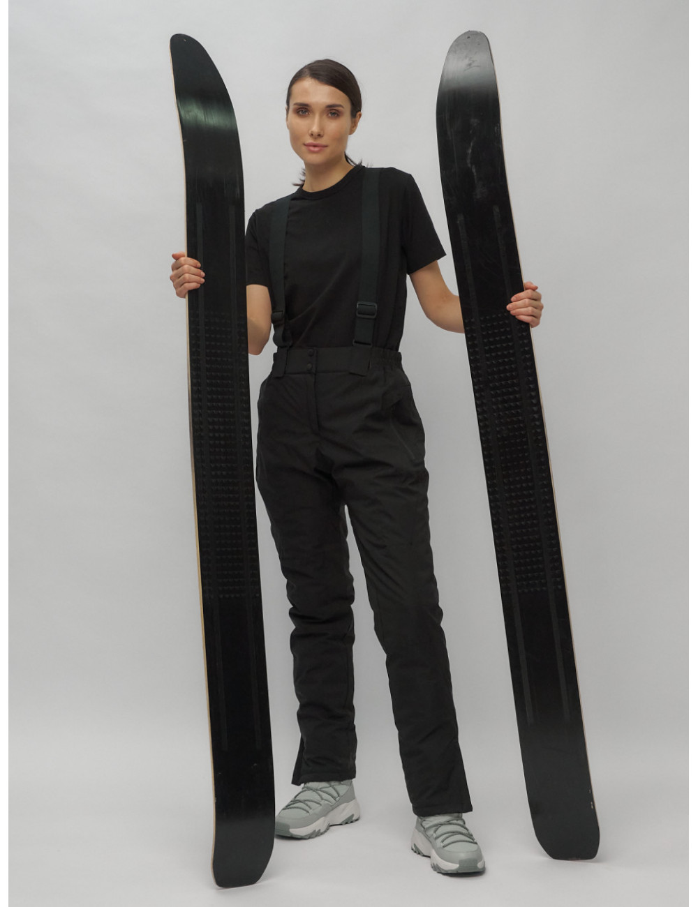 Зимний комплект верхней одежды для женщин включает горнолыжные брюки с бретелями и куртку с комбинированным принтом.