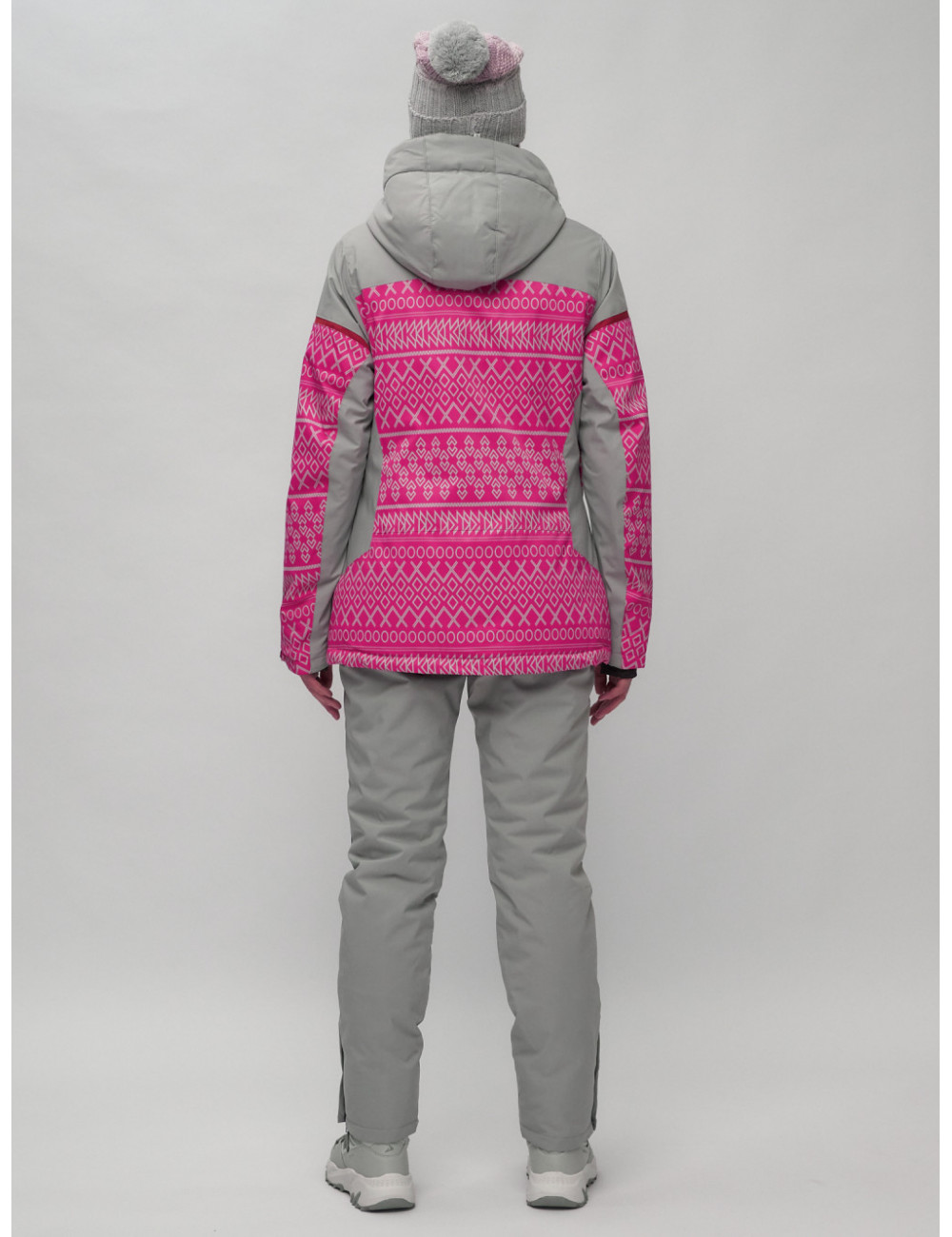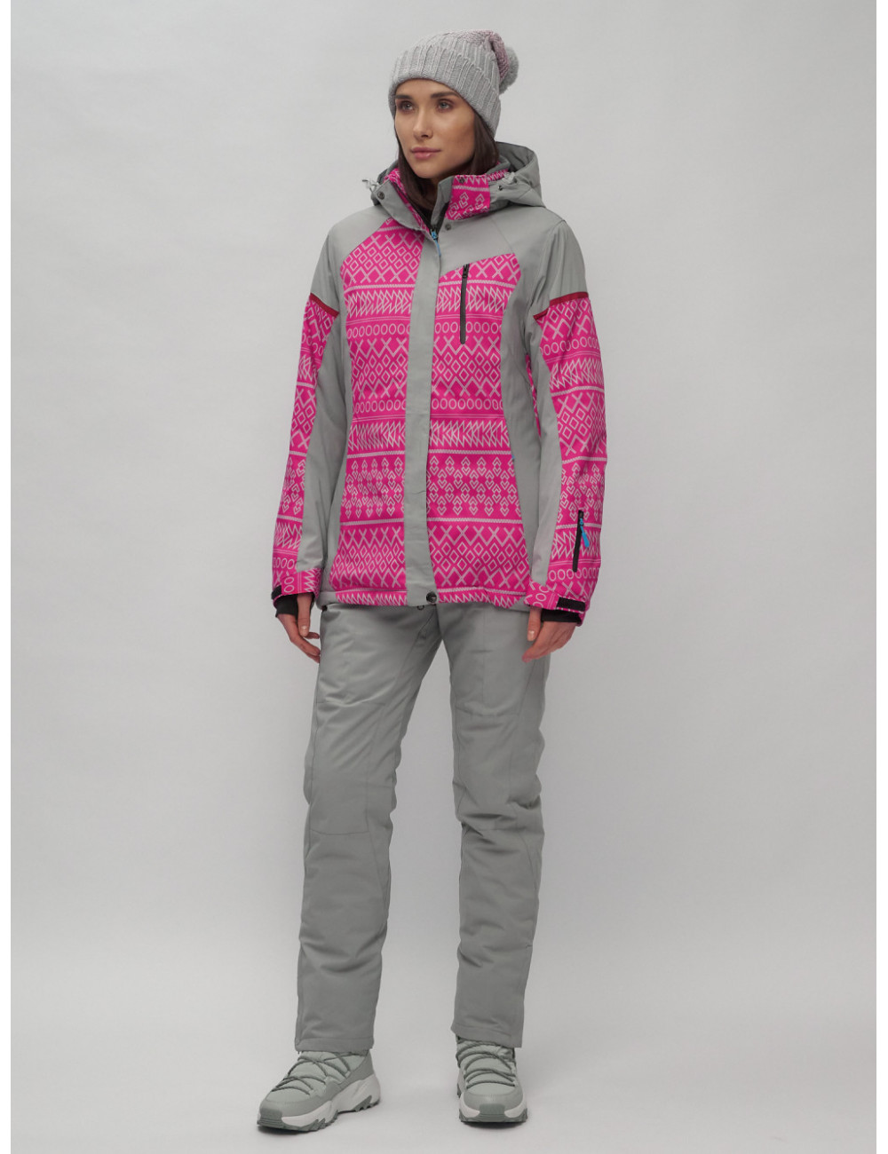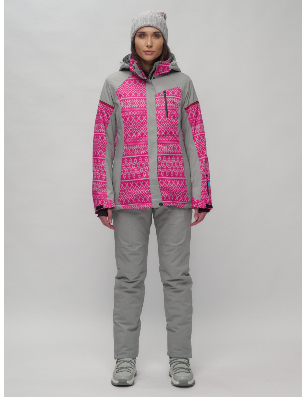 Стильный и функциональный комплект для зимних прогулок и активного отдыха. В комплект входят горнолыжные брюки с бретелями и куртка с геометрическим принтом.