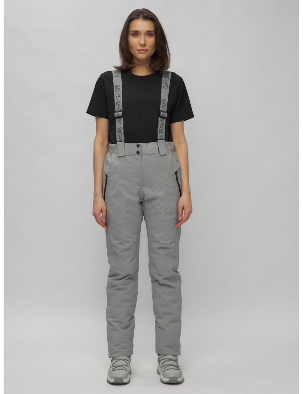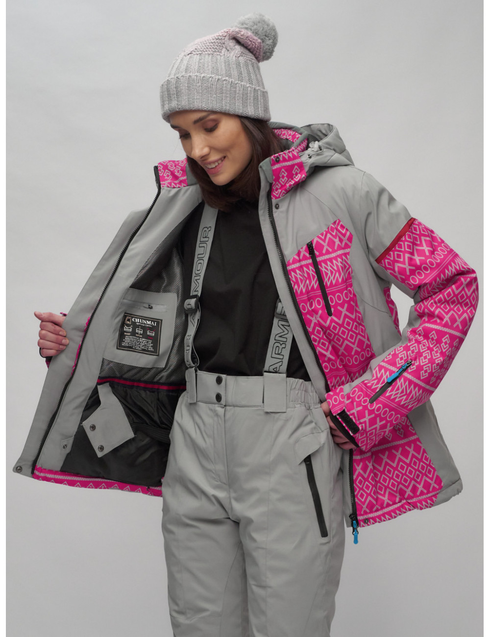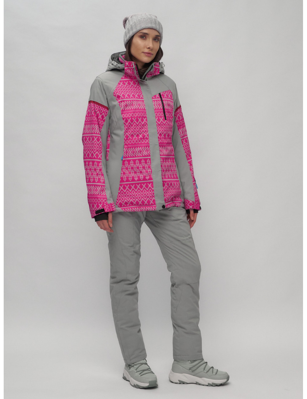 Стильный и функциональный комплект для зимних прогулок и активного отдыха. В комплект входят горнолыжные брюки с бретелями и куртка с геометрическим принтом.