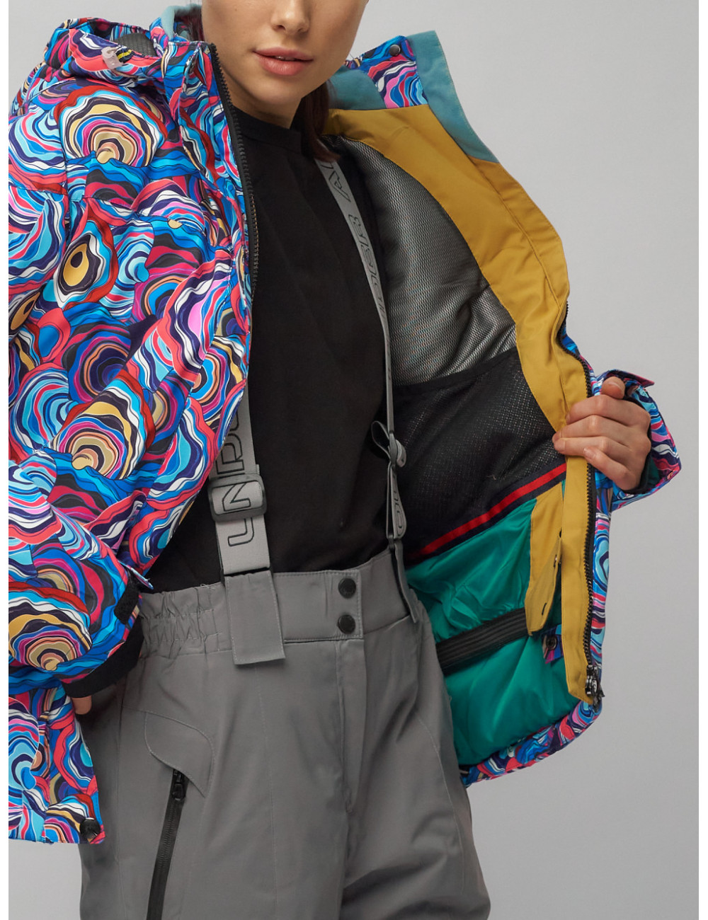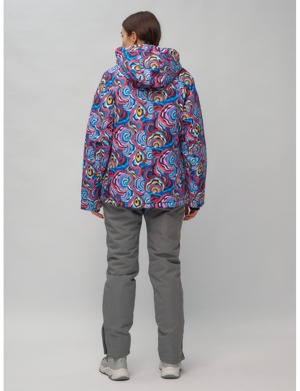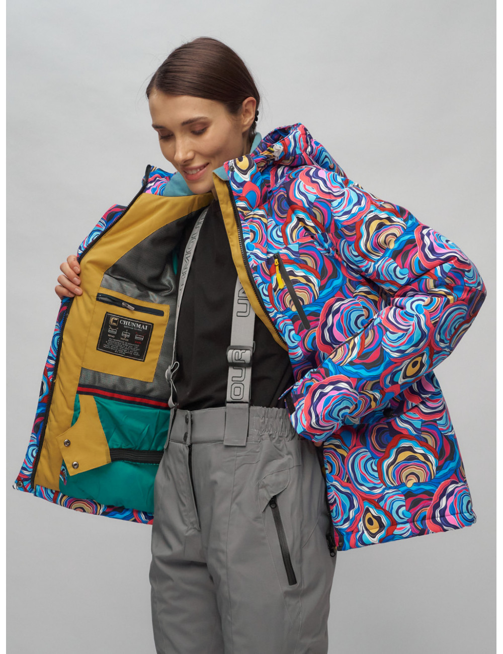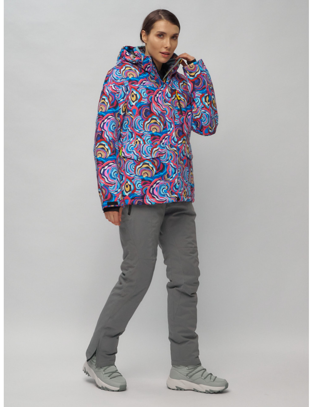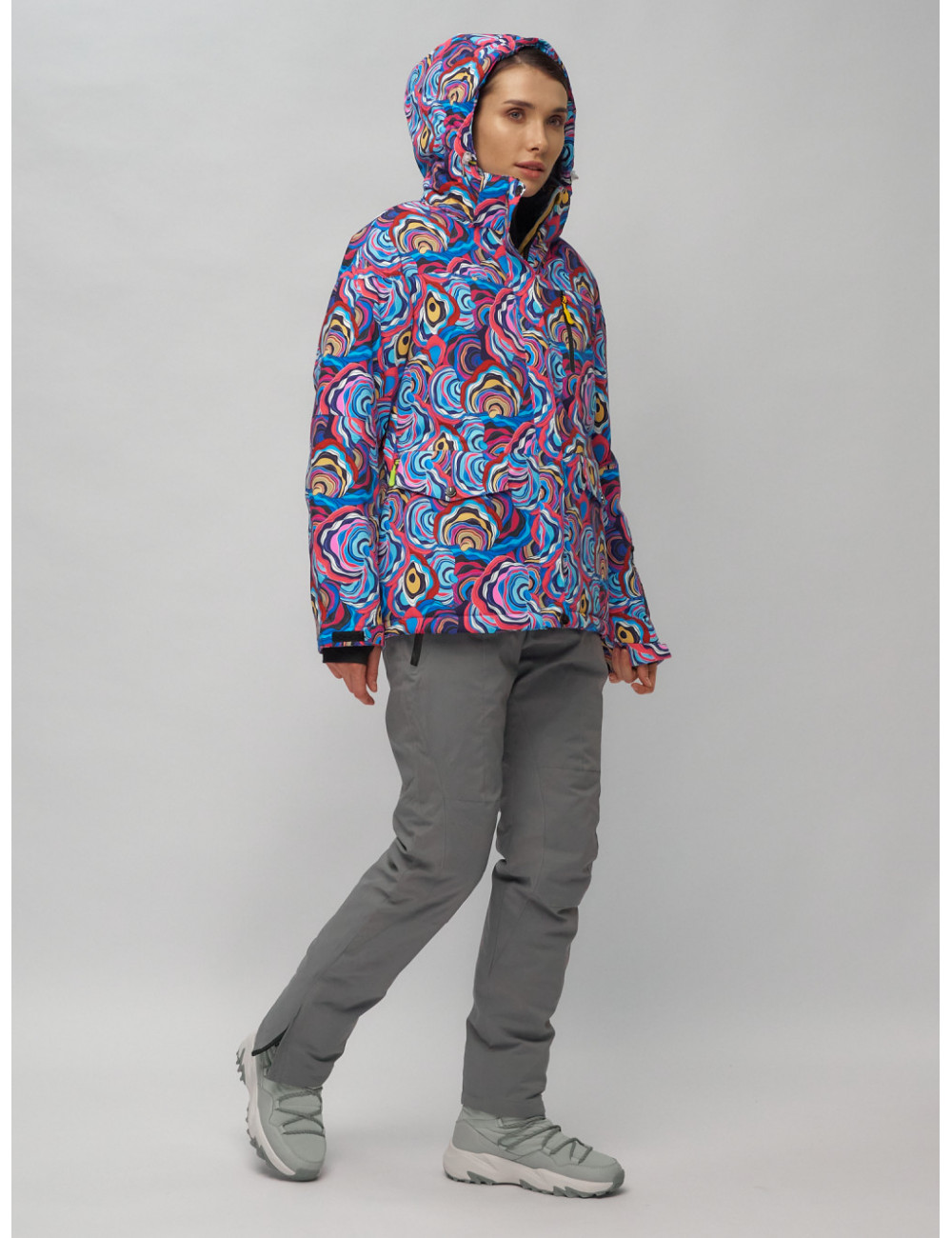 Комплект состоит из горнолыжных брюк с бретелями и привлекательной, полуприталенной куртки с цветочным принтом.