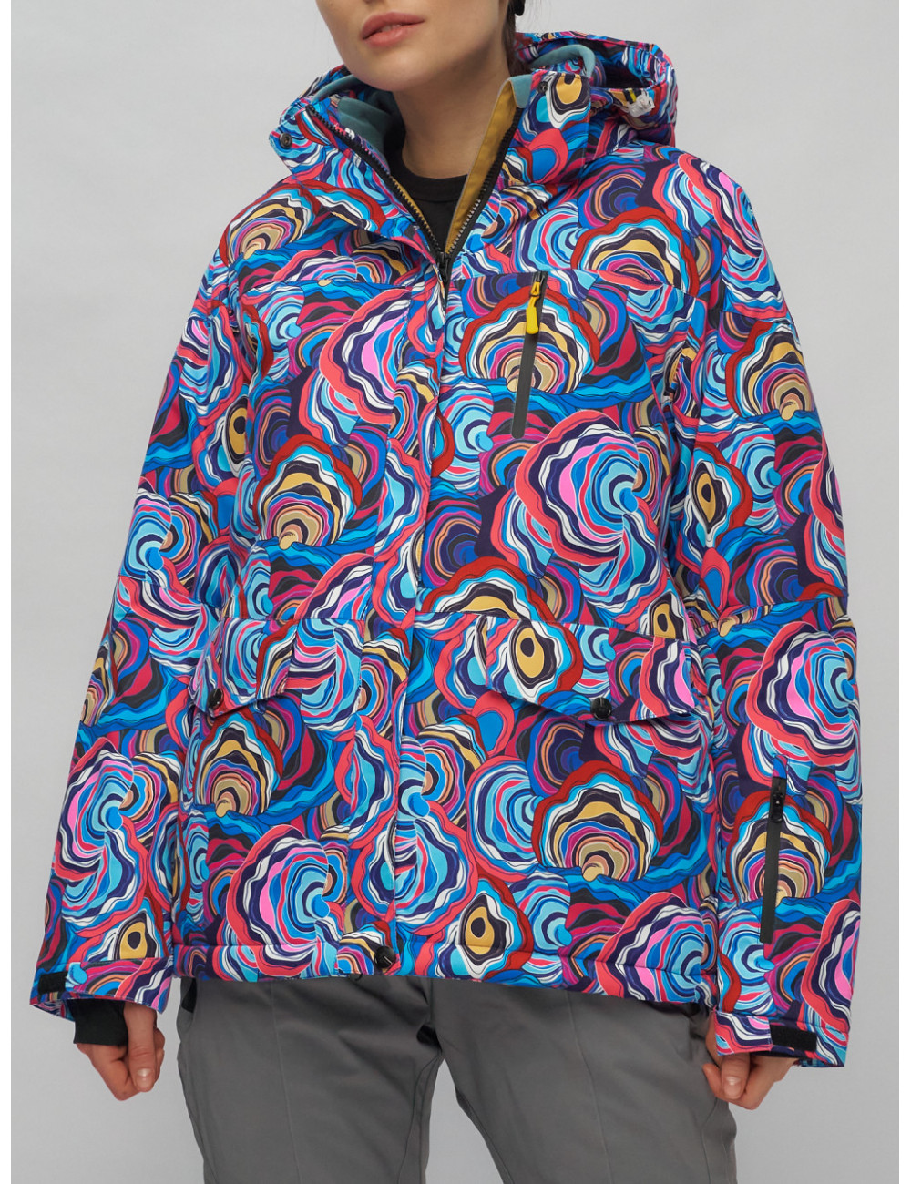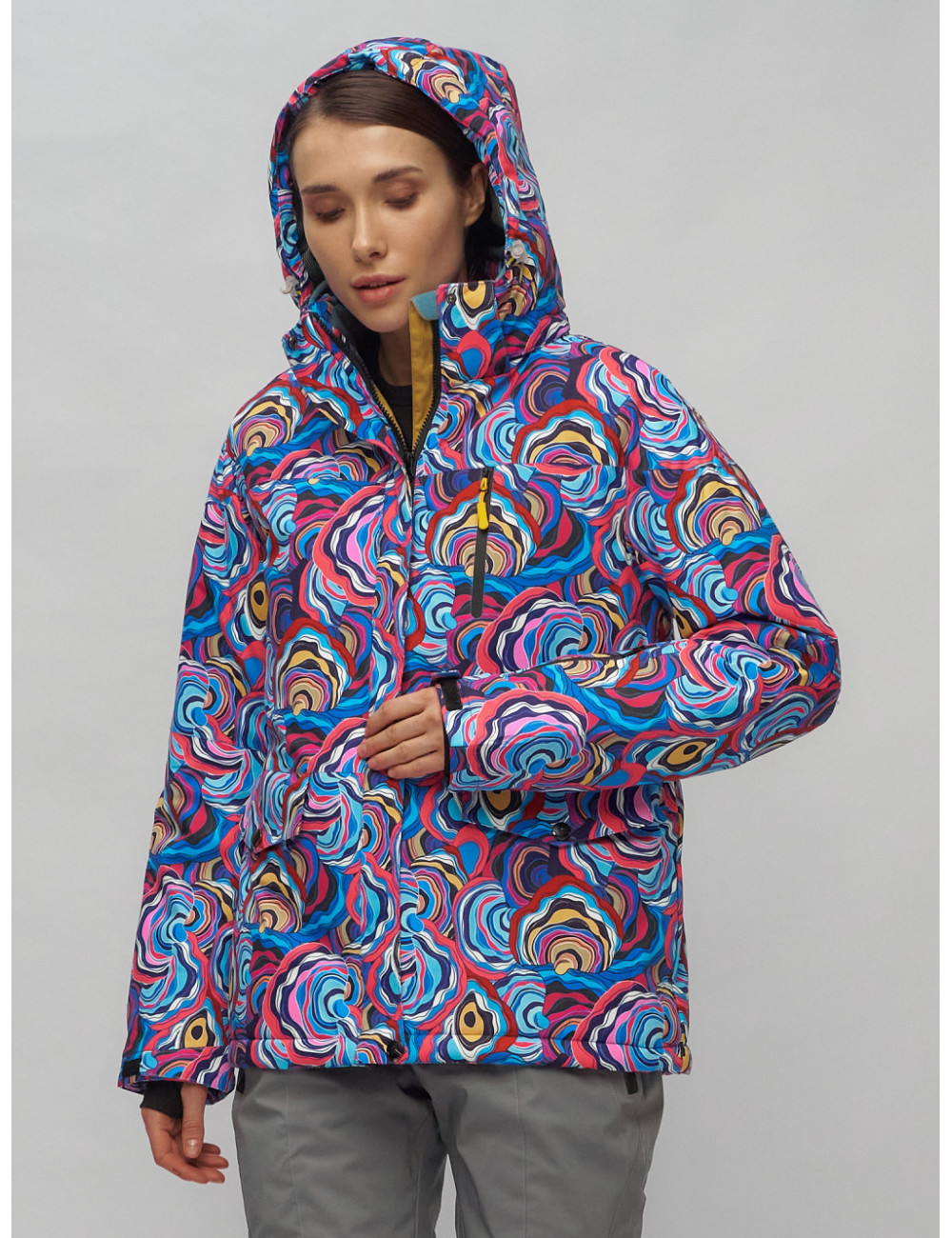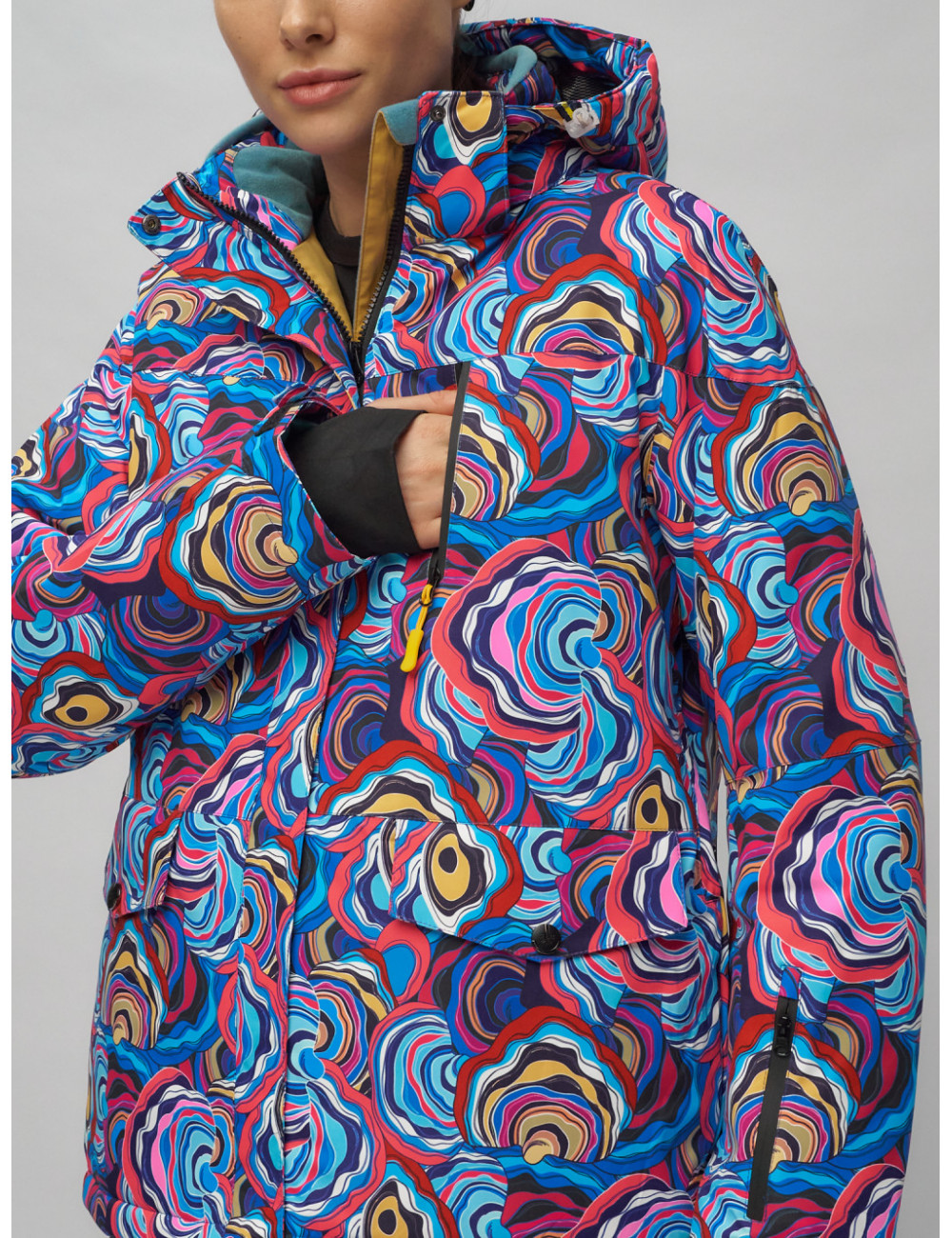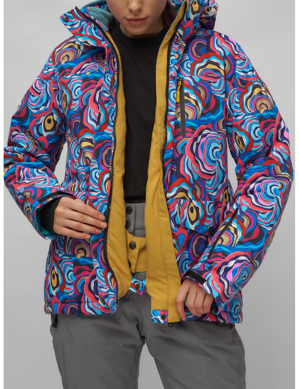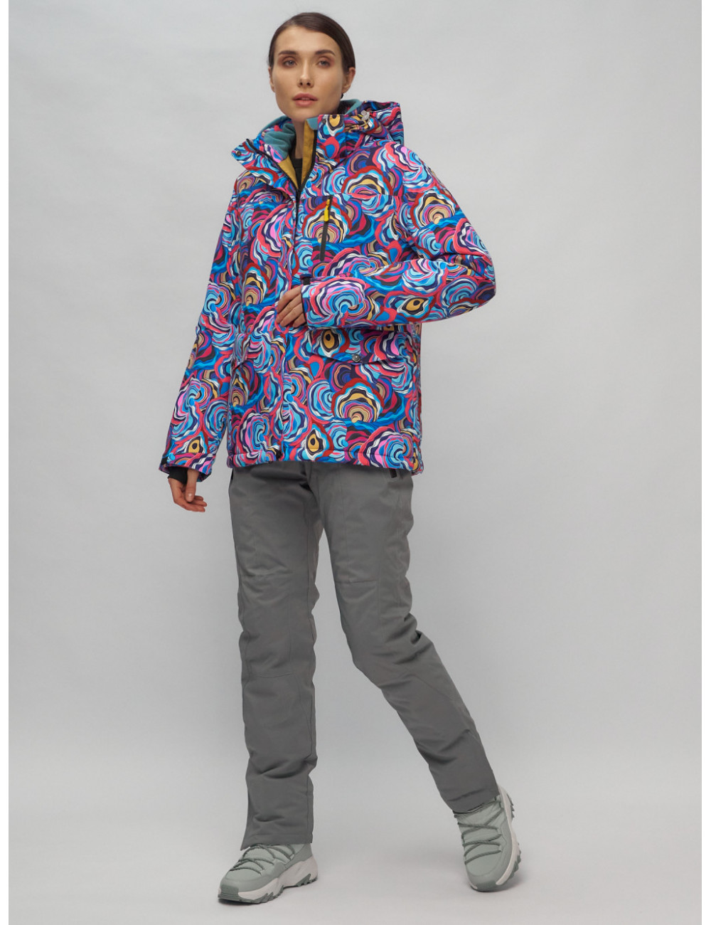 Комплект состоит из горнолыжных брюк с бретелями и привлекательной, полуприталенной куртки с цветочным принтом.