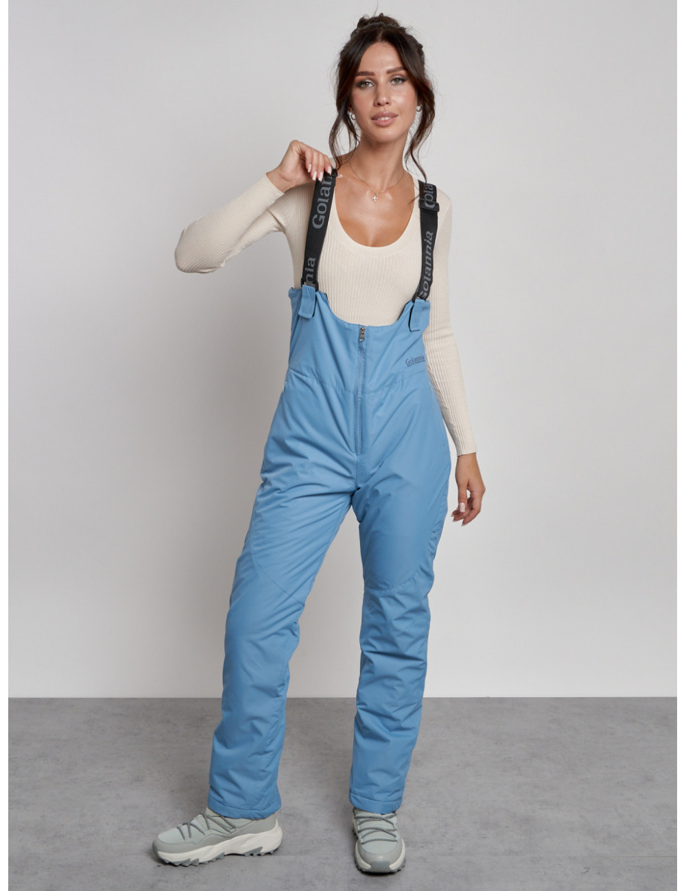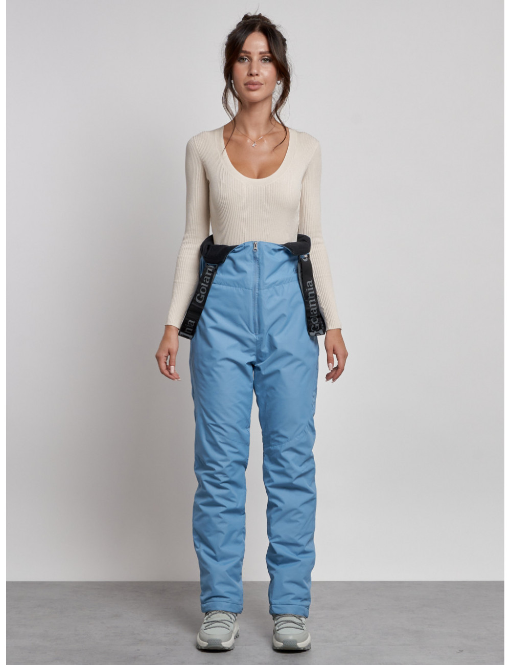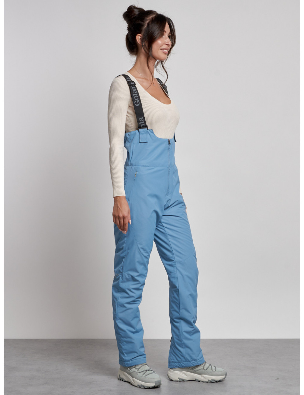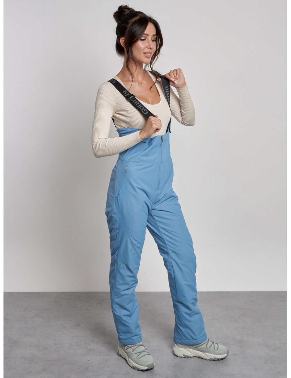С нашим полукомбинезоном вы сможете наслаждаться зимними видами спорта и активным отдыхом, не отвлекаясь на холод и дискомфорт. Доставка по Москве и Московской области Женский зимний полукомбинезон с высокой посадкой, голубой, брюки для холодного времени года.