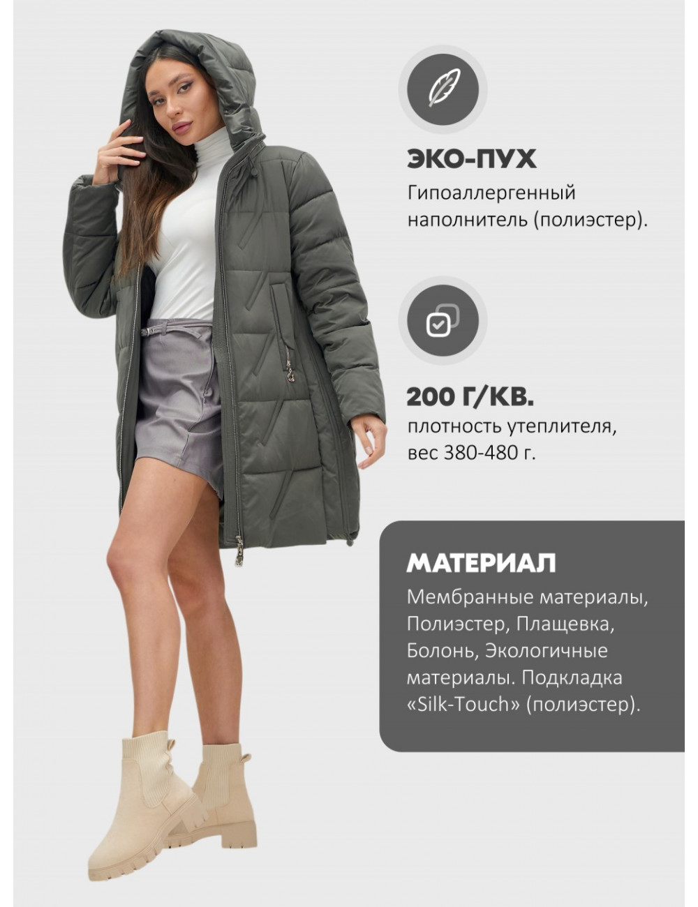 - Быстросохнущий и дышащий материал. Это делает пуховик идеальным выбором для осенне-зимнего сезона.