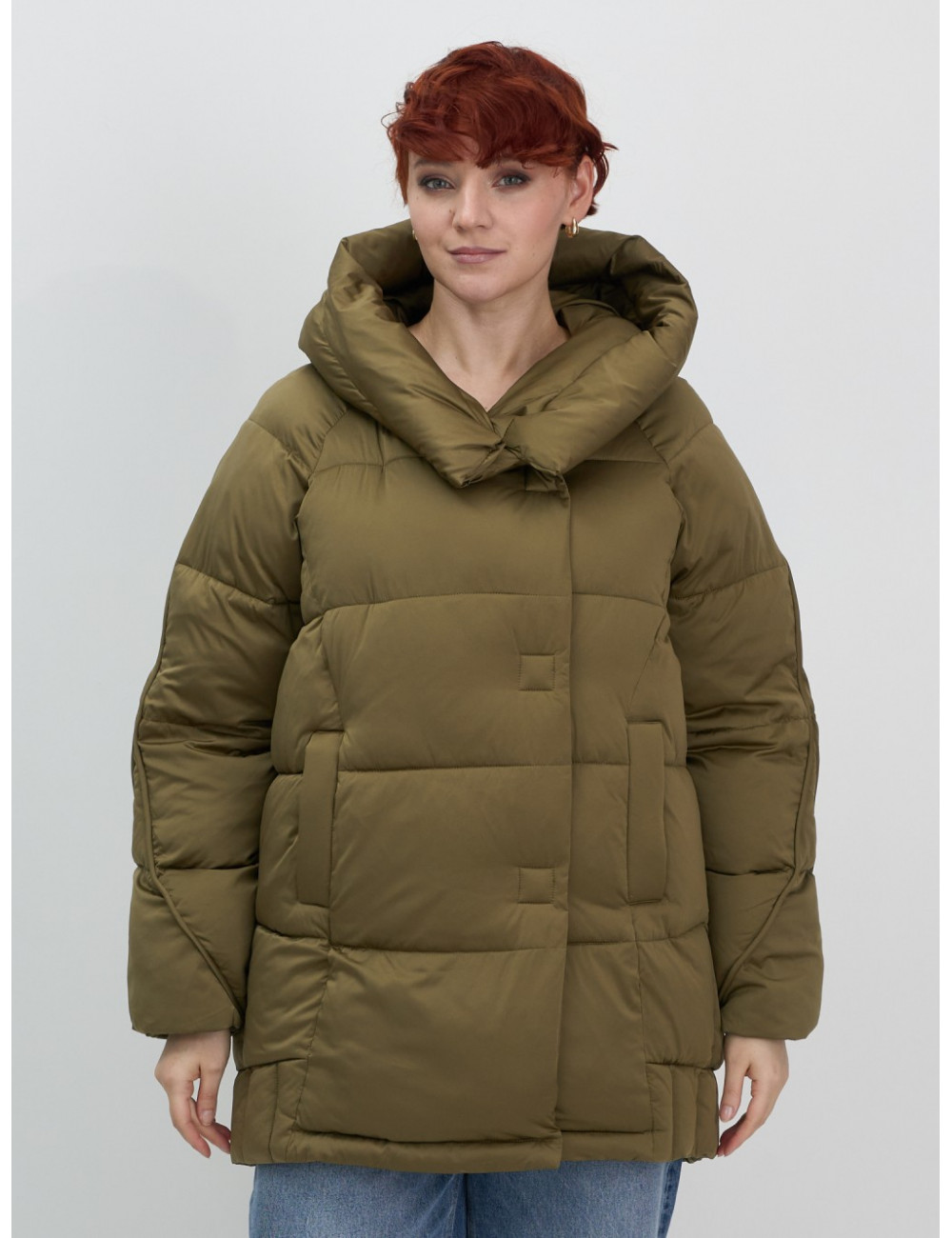 Женский зимний пуховик с капюшоном и декоративными карманами.
