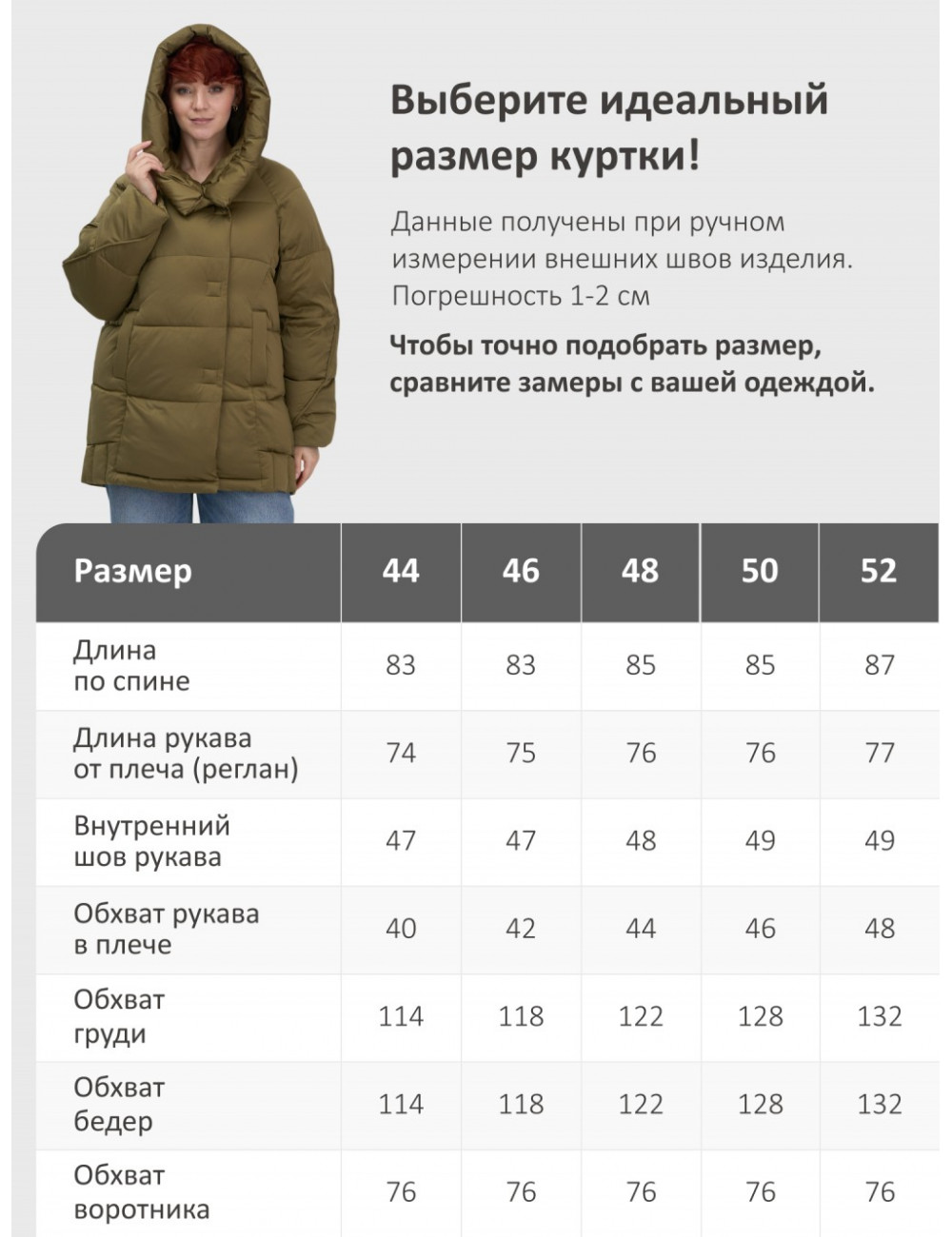 Пуховик доступен в размерах от 44 до 54.