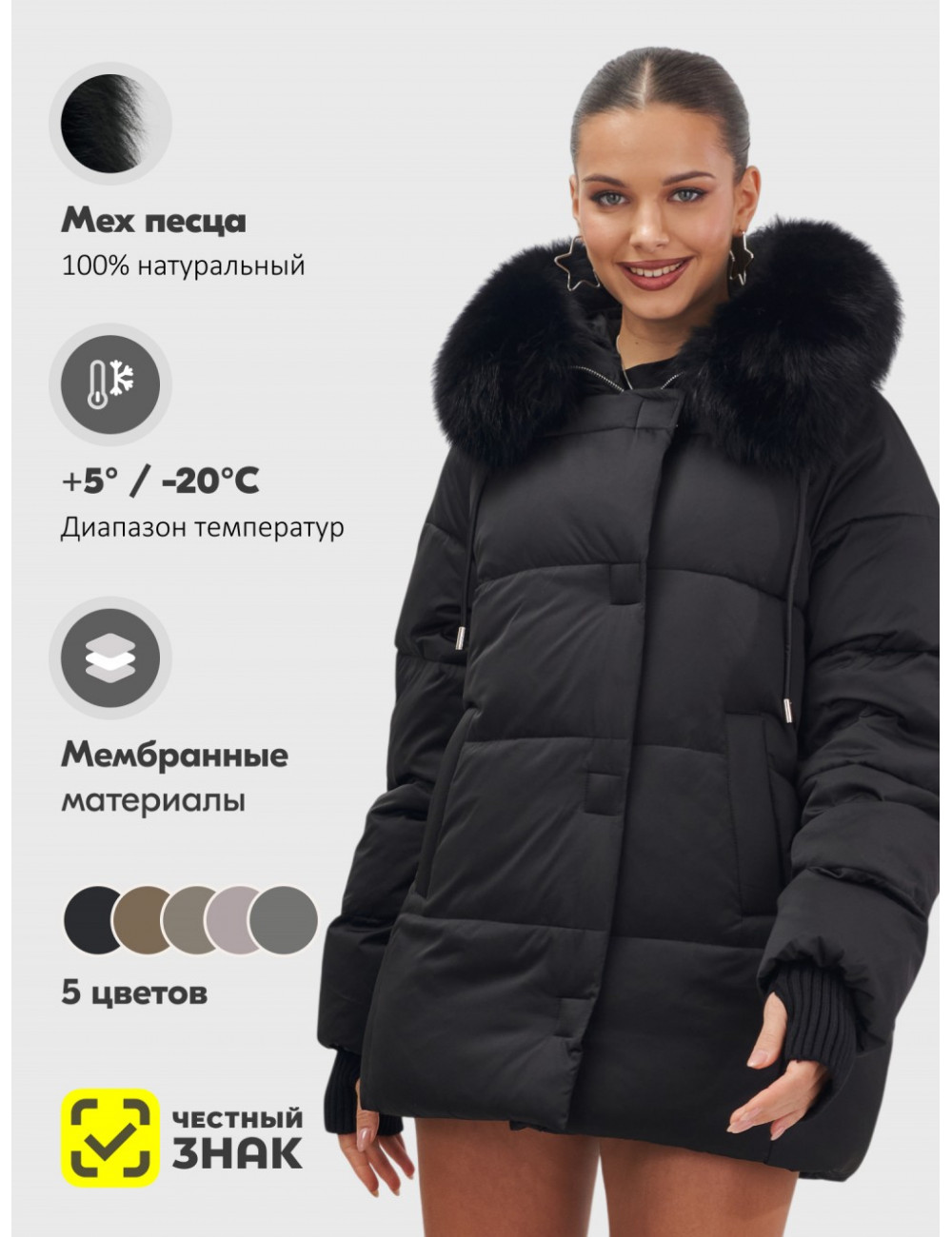 Пуховик представлен в четырёх актуальных оттенках: классический чёрный, роскошный коричневый, изысканный светло-коричневый и трендовый горчичный. Эти цвета гармонично сочетаются с натуральным мехом песца.
