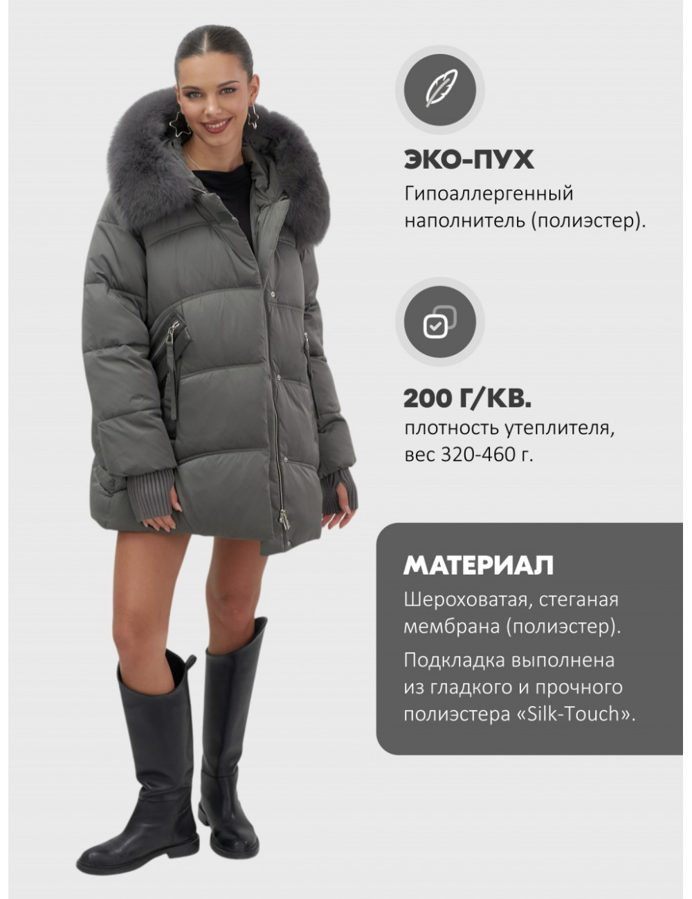 Особенности модели | быстросохнущая, ветрозащита, водоотталкивающий материал, гипоаллергенный материал, дышащий материал, съемная опушка |