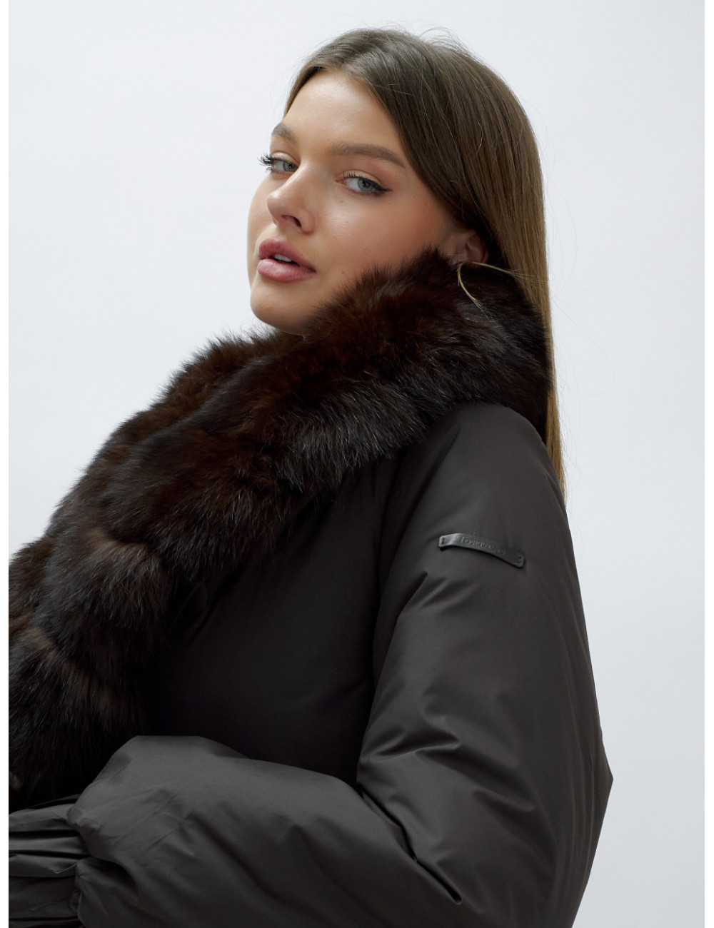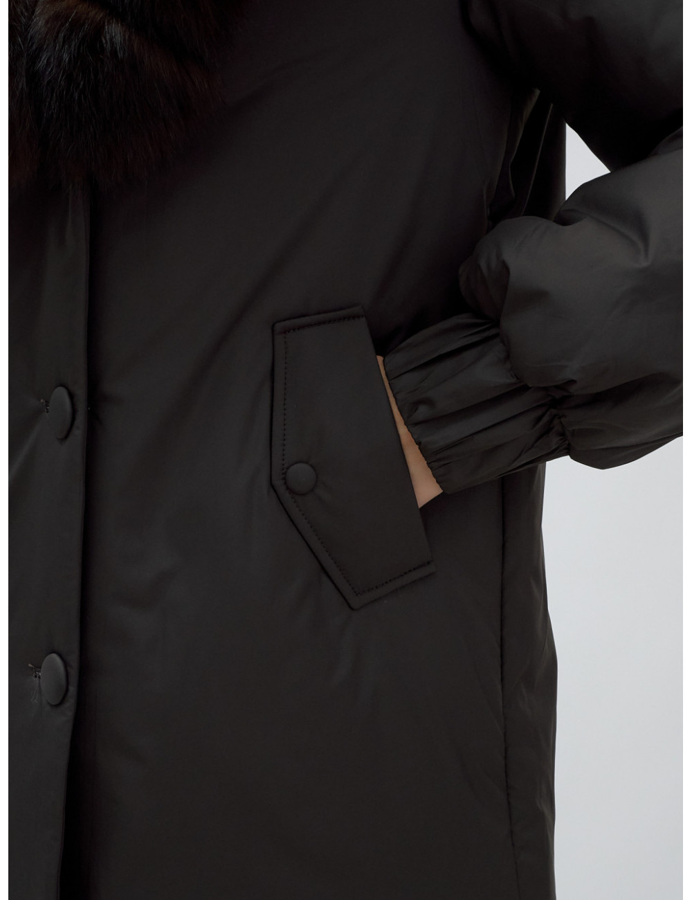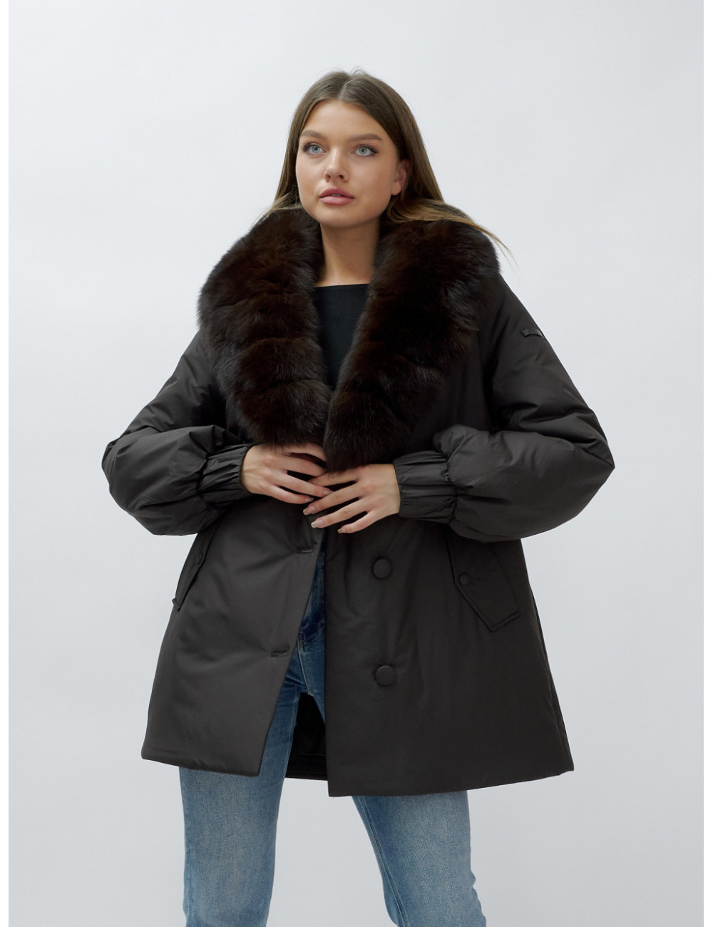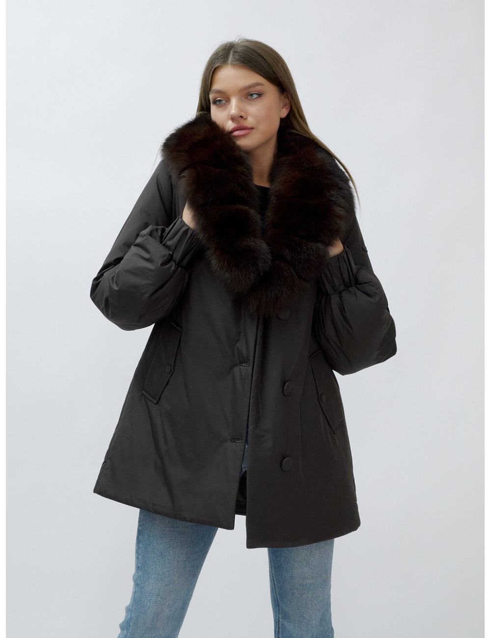 - Натуральная опушка. Съёмный пушистый воротник из меха песца, обработанного под соболя, добавляет роскоши и позволяет менять стиль в зависимости от настроения.