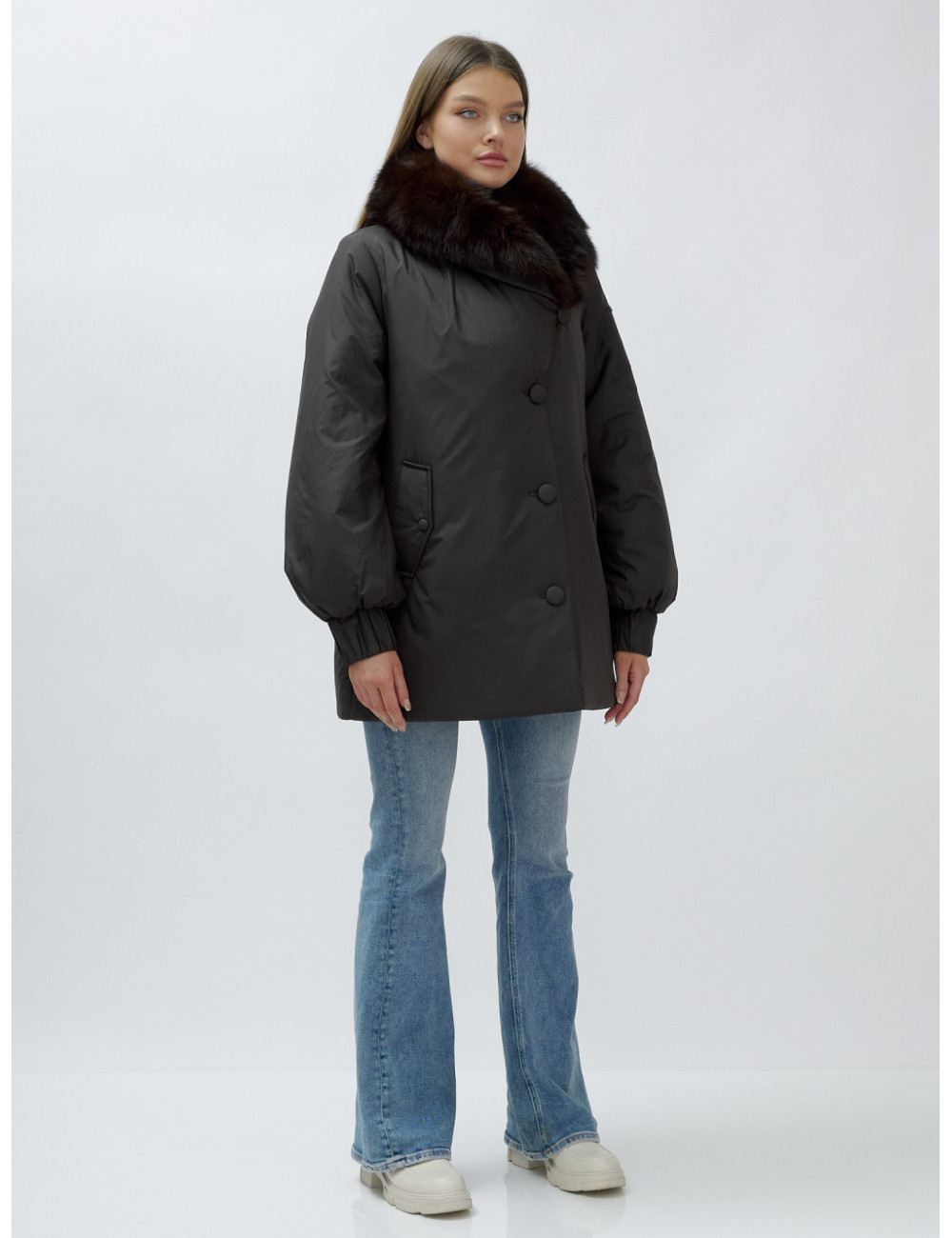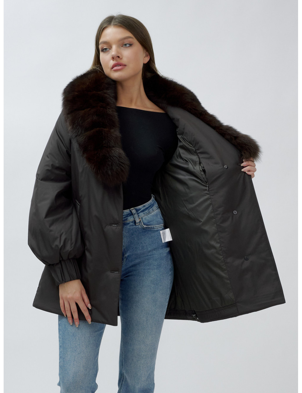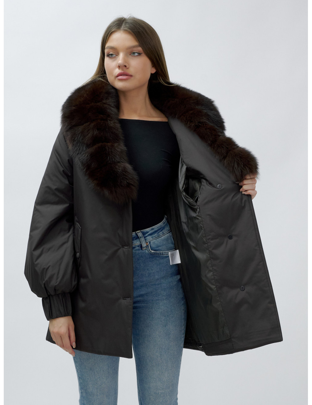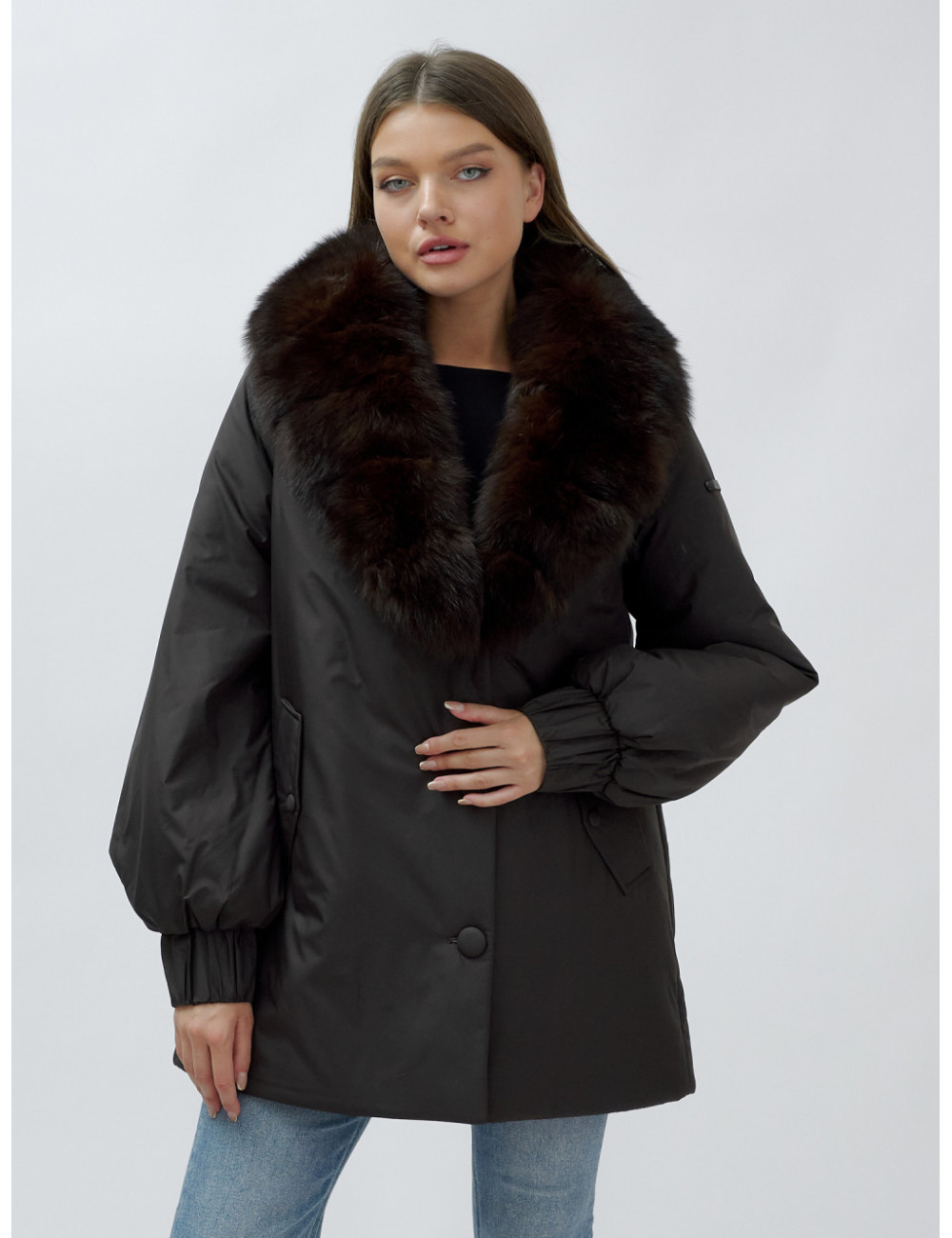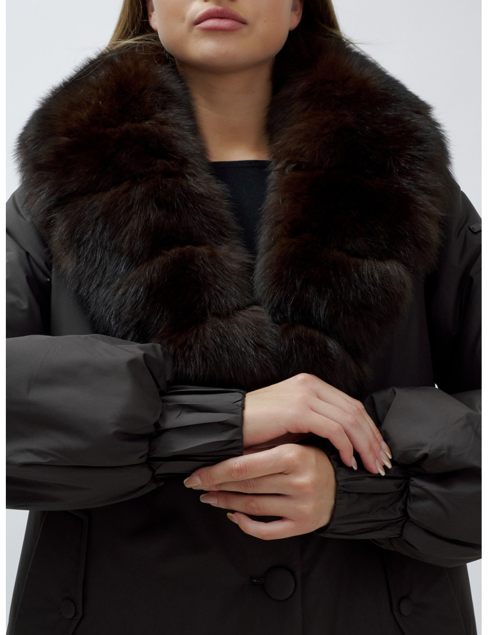 - Натуральная опушка. Съёмный пушистый воротник из меха песца, обработанного под соболя, добавляет роскоши и позволяет менять стиль в зависимости от настроения.