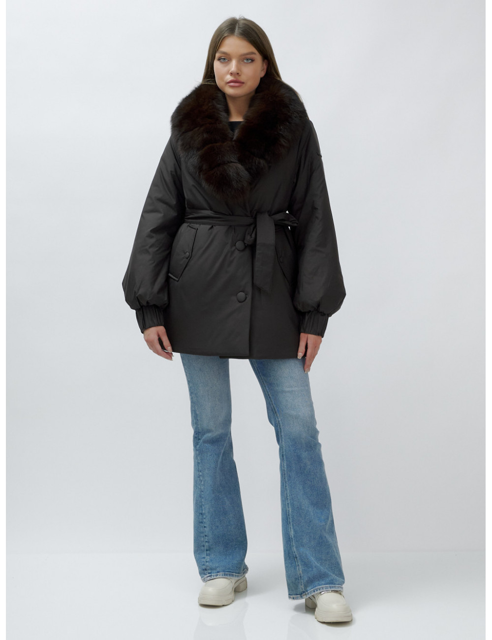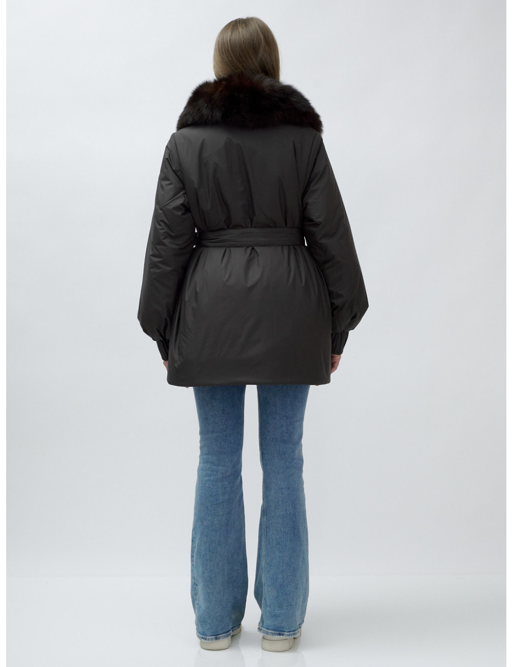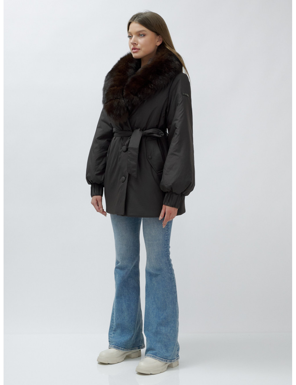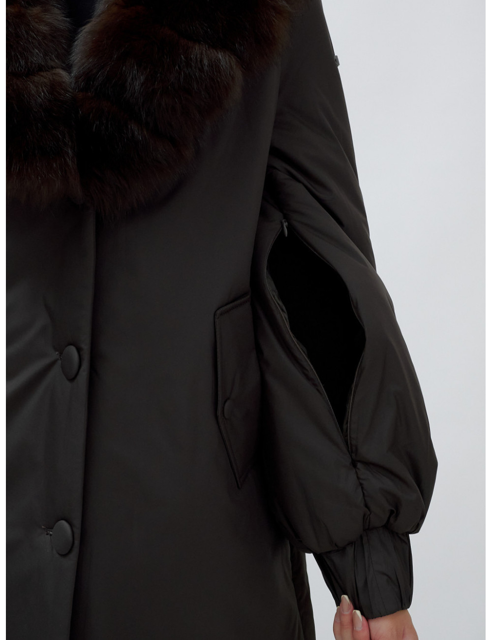 - Натуральная опушка. Съёмный пушистый воротник из меха песца, обработанного под соболя, добавляет роскоши и позволяет менять стиль в зависимости от настроения.