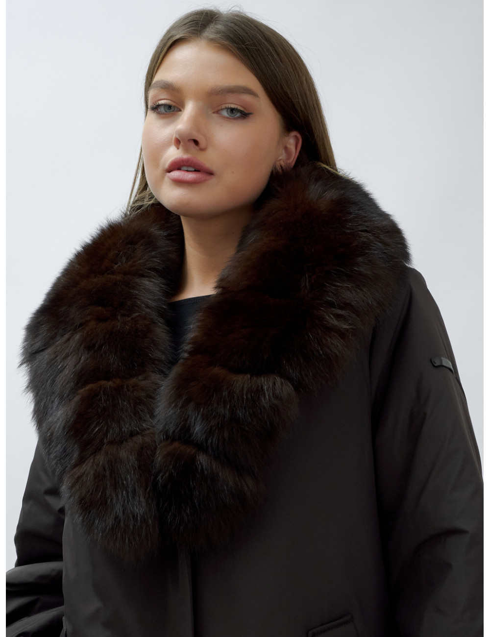 Доставка Удлинённый пуховик женский зимний с мехом песца, тёмно-коричневый. по Тюмени и Тюменской области СДЭК
