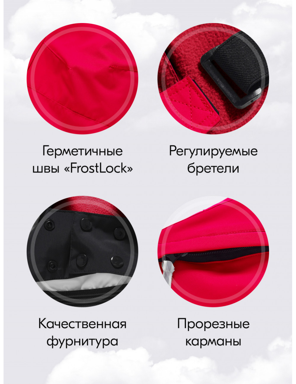 - Снегозащитная юбка: предотвращает попадание снега под одежду.