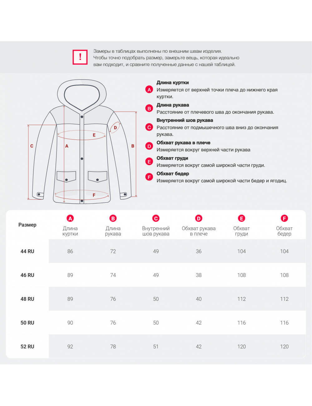Наш пуховик доступен в размерах от 44 до 52. Для выбора идеального размера рекомендуется измерить основные параметры (длину изделия, длину рукава, обхват груди и т. д.) и сверить их с таблицей размеров.
