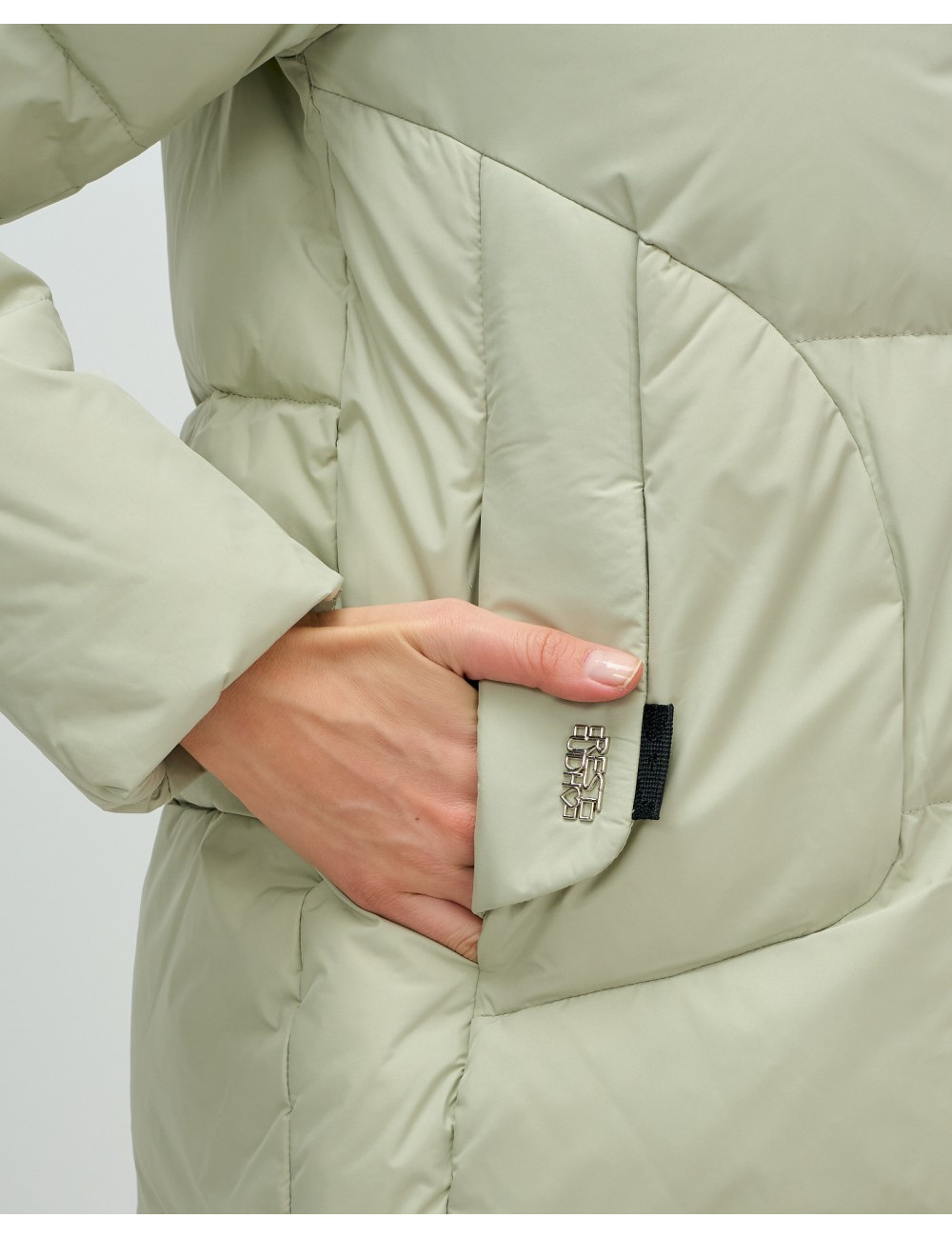 Пуховик имеет прямой и свободный покрой, длину до колена и длинные рукава с манжетами. Это обеспечивает комфорт и свободу движений.