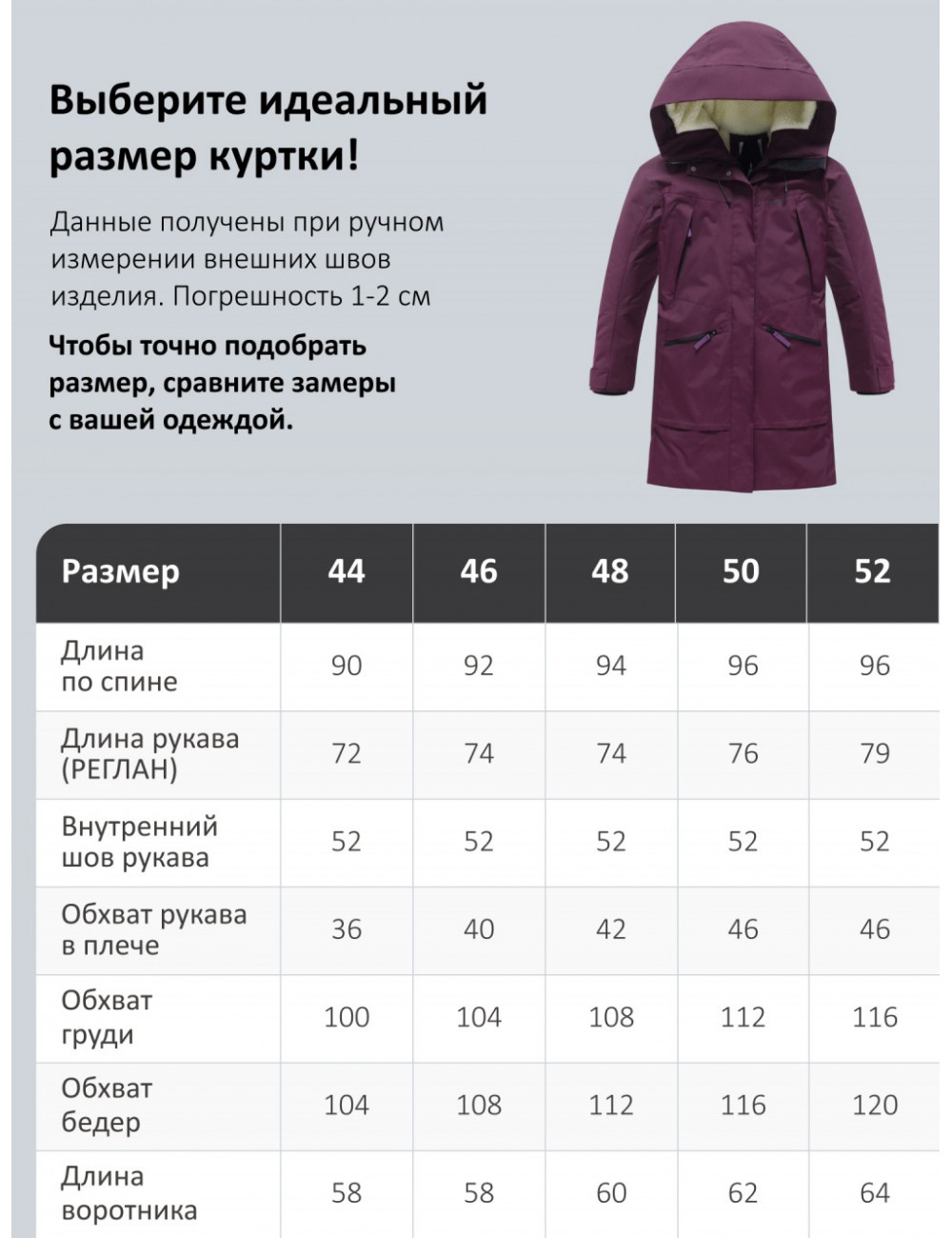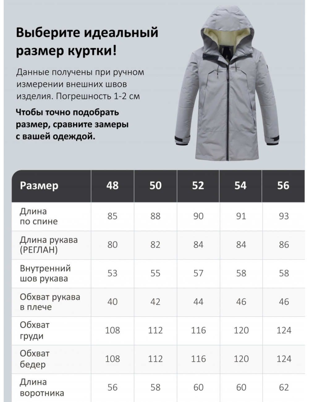 Парка имеет свободный крой, который обеспечивает комфорт и свободу движений. Однако для точного подбора размера рекомендуется измерить основные параметры (длина куртки, длина рукава, обхват груди и т. д.) и сверить их с размерной сеткой.