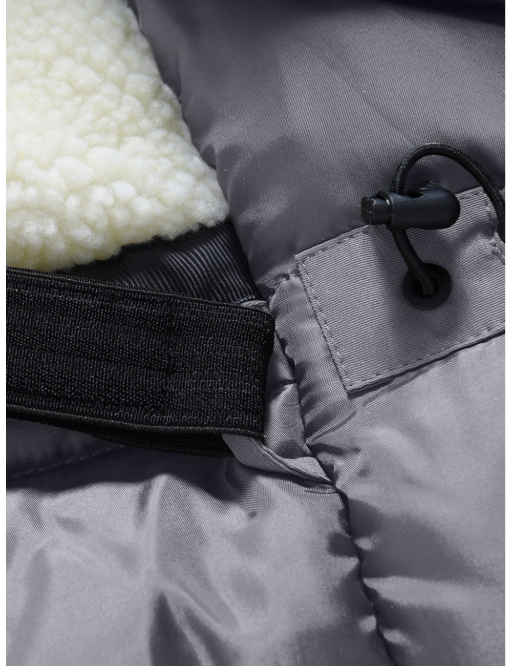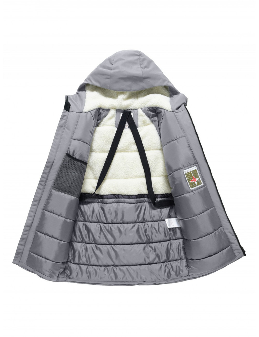 Внутренняя подкладка из овчины, полиэстера и флиса делает парку тёплой и уютной. Несъёмный капюшон надёжно защищает от снега и ветра, а воротник-стойка прикрывает шею.