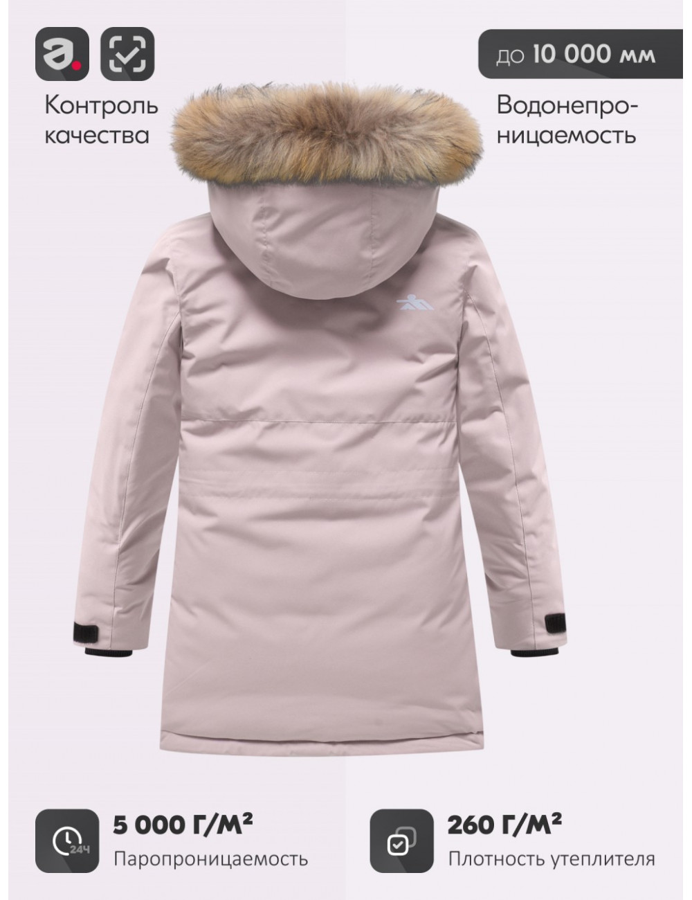 Капюшон с меховой опушкой — это не только дополнительная защита от холода, но и стильный акцент. Прочные молнии и удобные липучки на манжетах надёжно фиксируют куртку.
