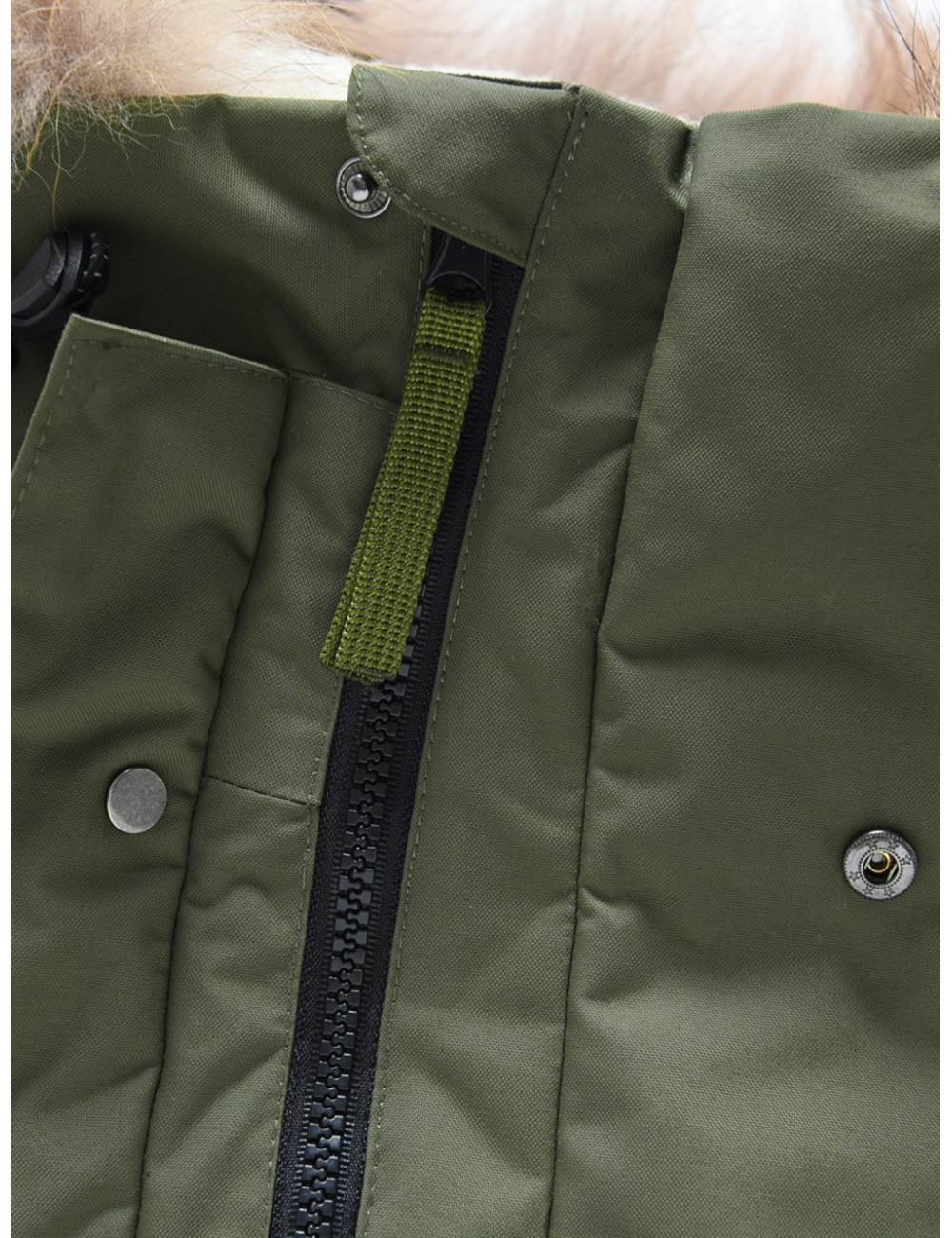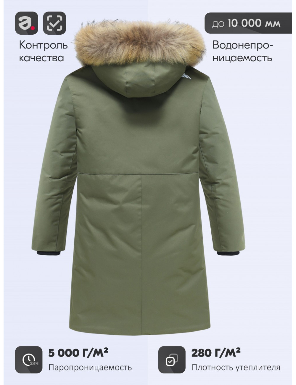Верхняя часть парки выполнена из прочной плотной ткани с водоотталкивающими свойствами. Проклеенные швы дополнительно защищают от промокания. Современный утеплитель тинсулейт сохраняет тепло даже при морозах до –25 градусов, оставаясь лёгким и тонким. Внутренняя подкладка из овчины, полиэстера и флиса делает парку особенно уютной и приятной к телу.