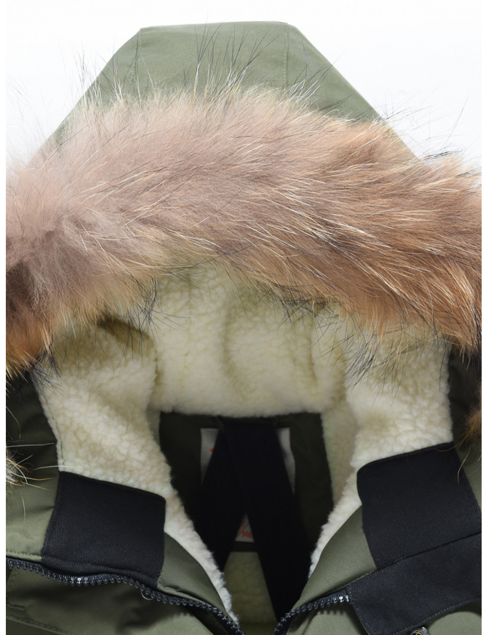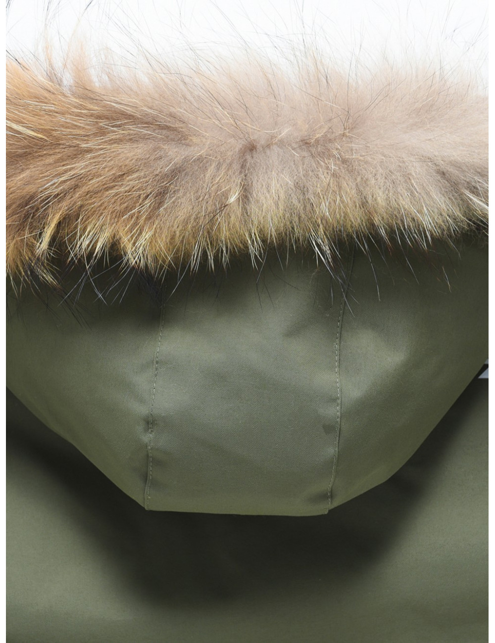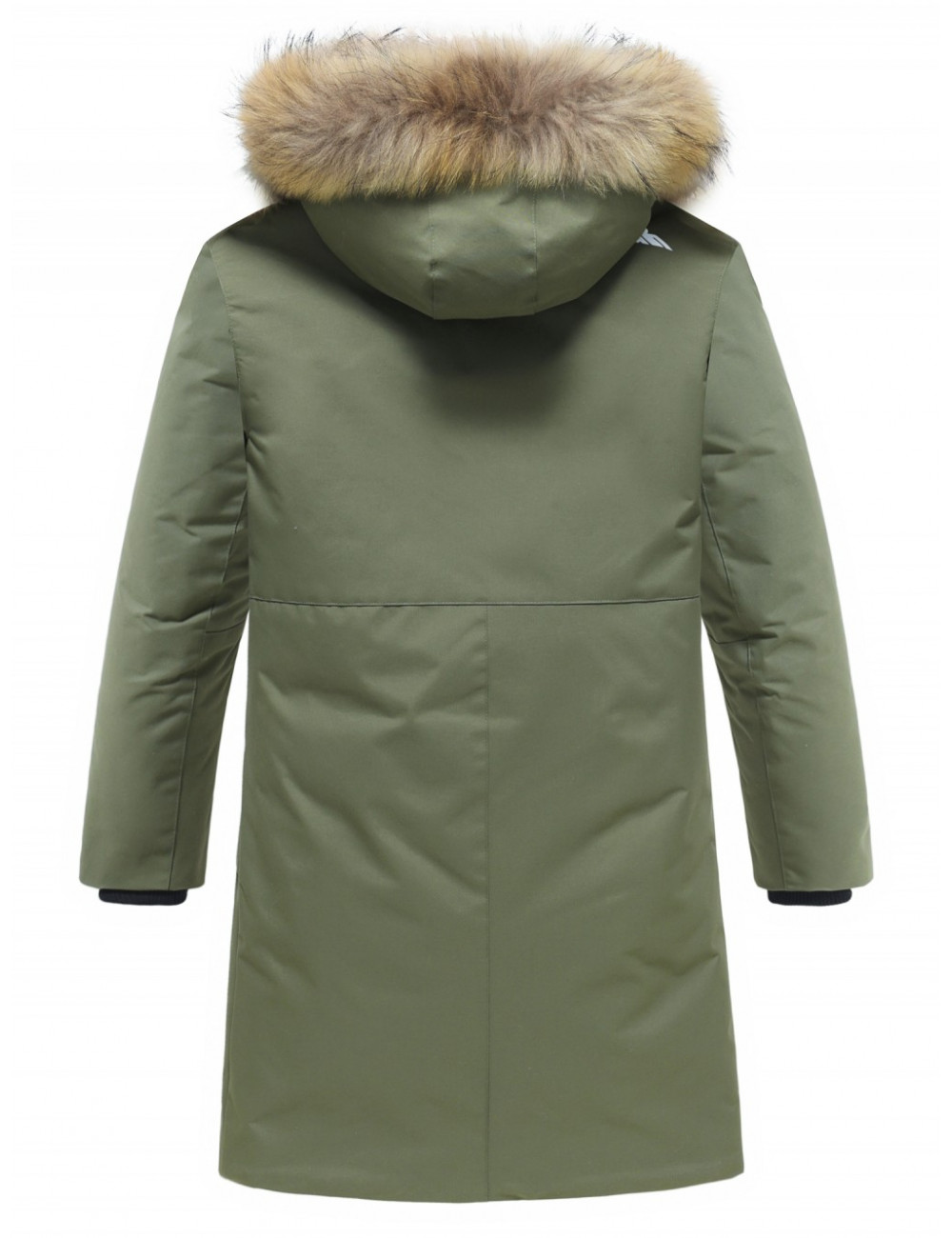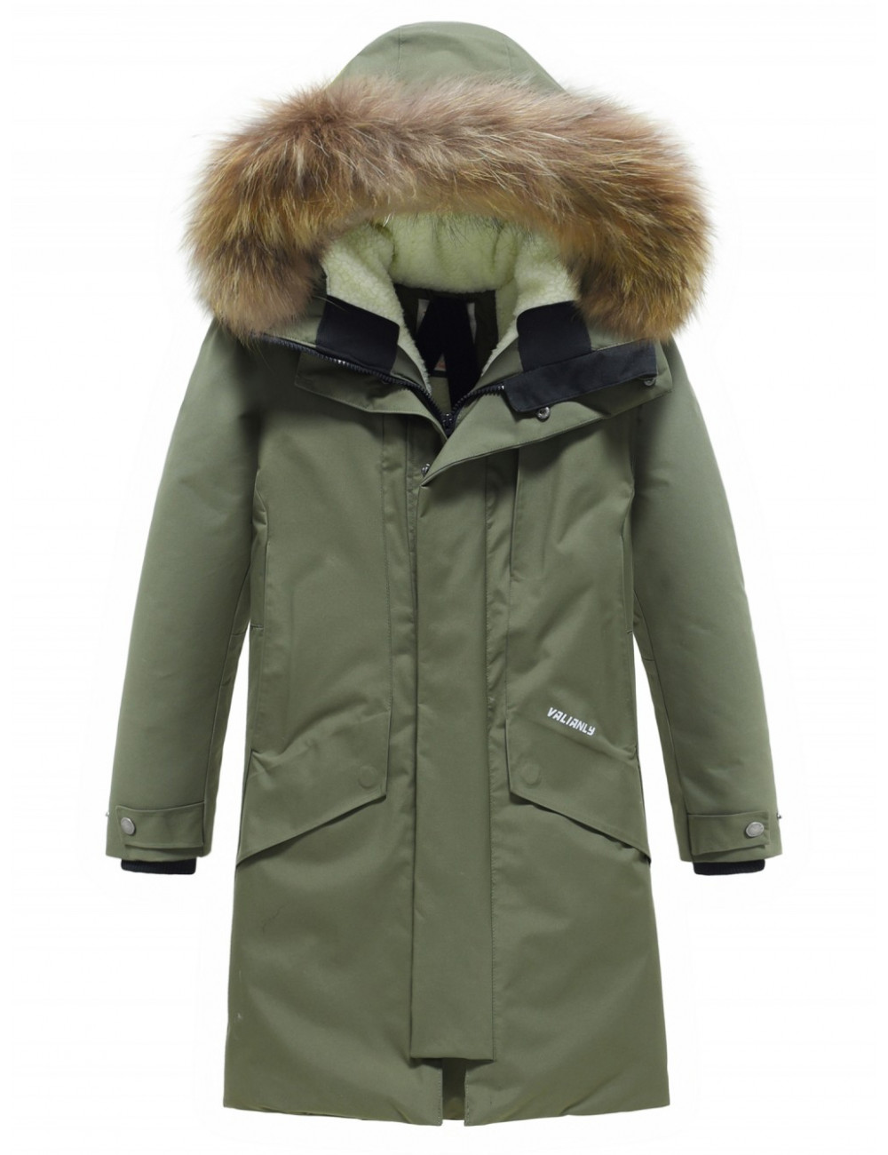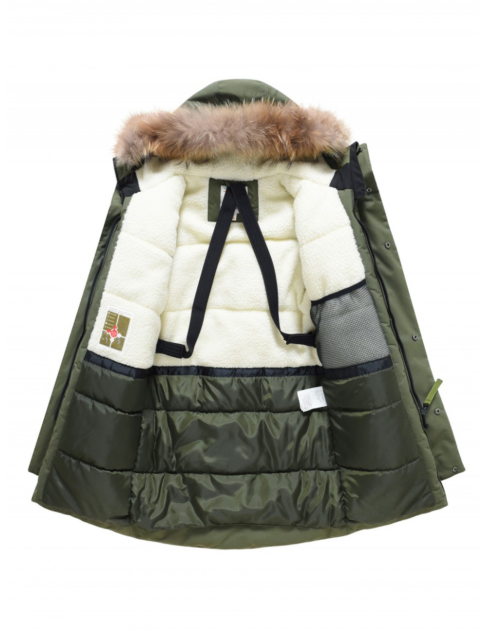 Удлинённый свободный крой до колена обеспечивает удобство и свободу движений. Тёплый капюшон с натуральным мехом енота надёжно защищает от снега и ветра. Опушка на молнии при желании легко снимается. Стояче-отложной воротник прикрывает шею и даёт дополнительную защиту в непогоду.