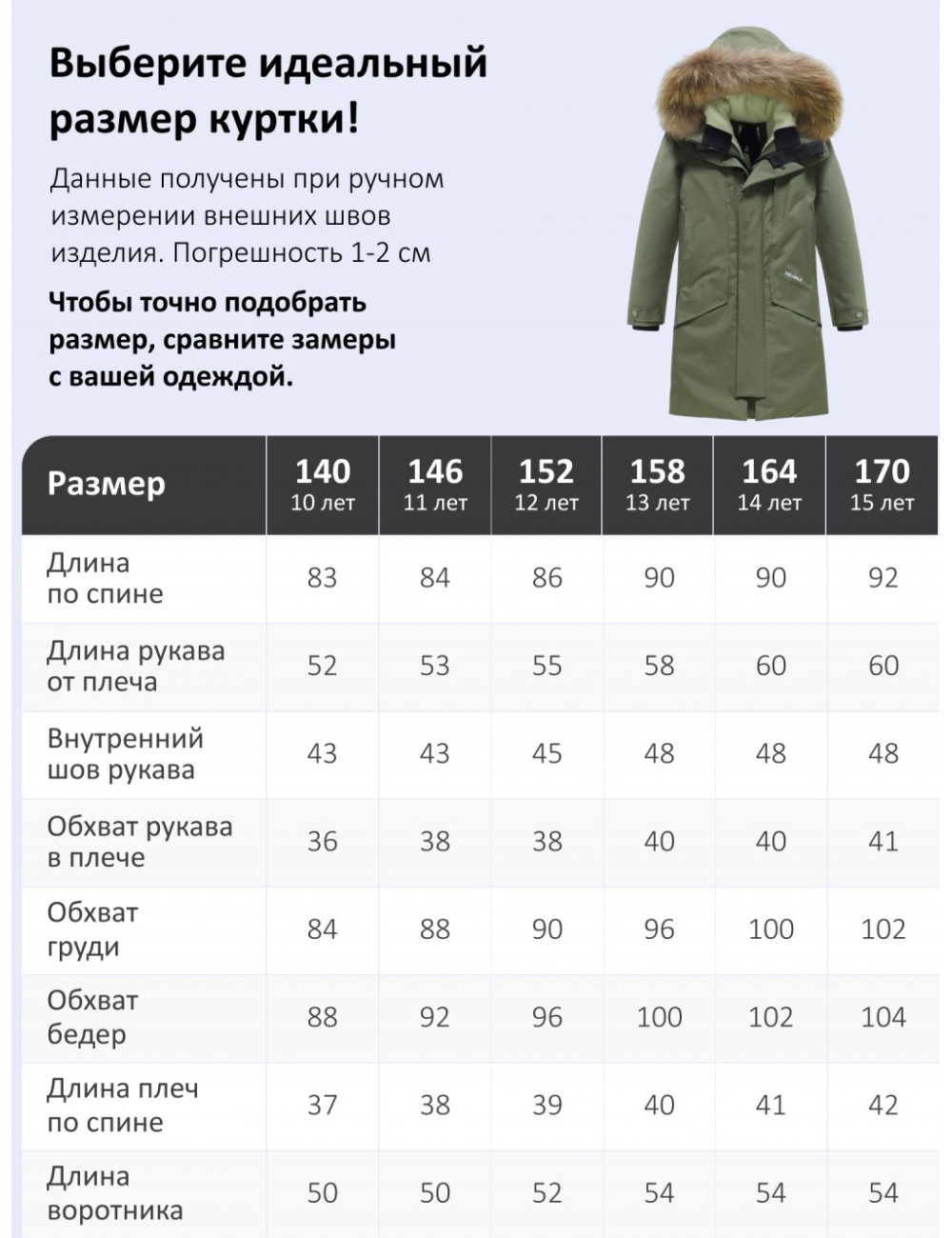 При выборе размера рекомендуется измерить следующие параметры: длину куртки, длину рукава, внутренний шов рукава, обхват рукава в плече, обхват груди, обхват бёдер, длину плеч по спине. Допустимые отклонения от фактических замеров могут составить не более ±0,5 см.