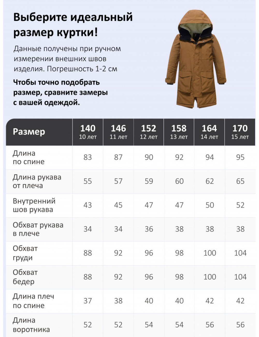 При выборе размера рекомендуем измерить следующие параметры: длину куртки, длину рукава, внутренний шов рукава, обхват рукава в плече, обхват груди, обхват бёдер, длину плеч по спине и длину воротника. Для более точного выбора размера обратитесь к таблице размеров на сайте.