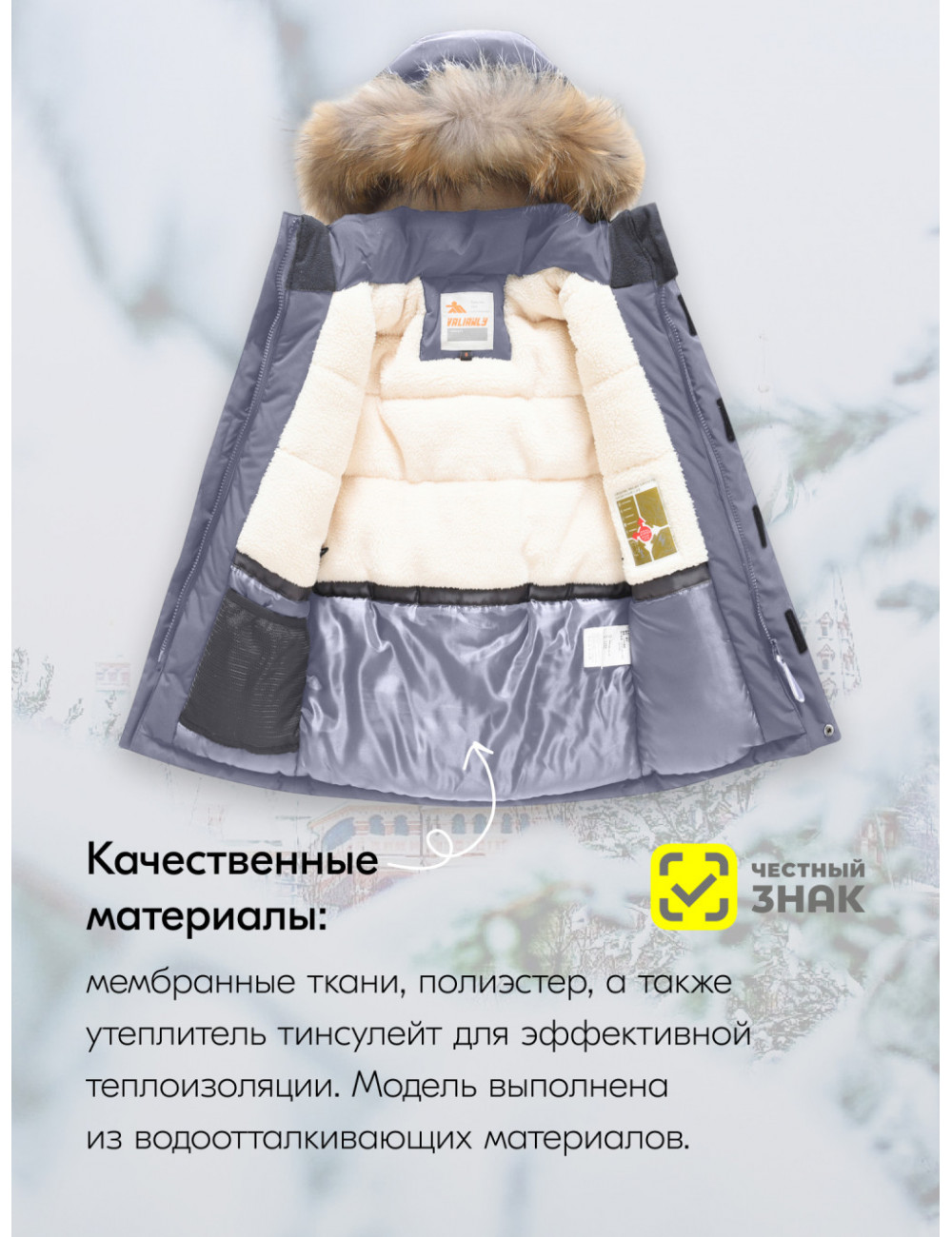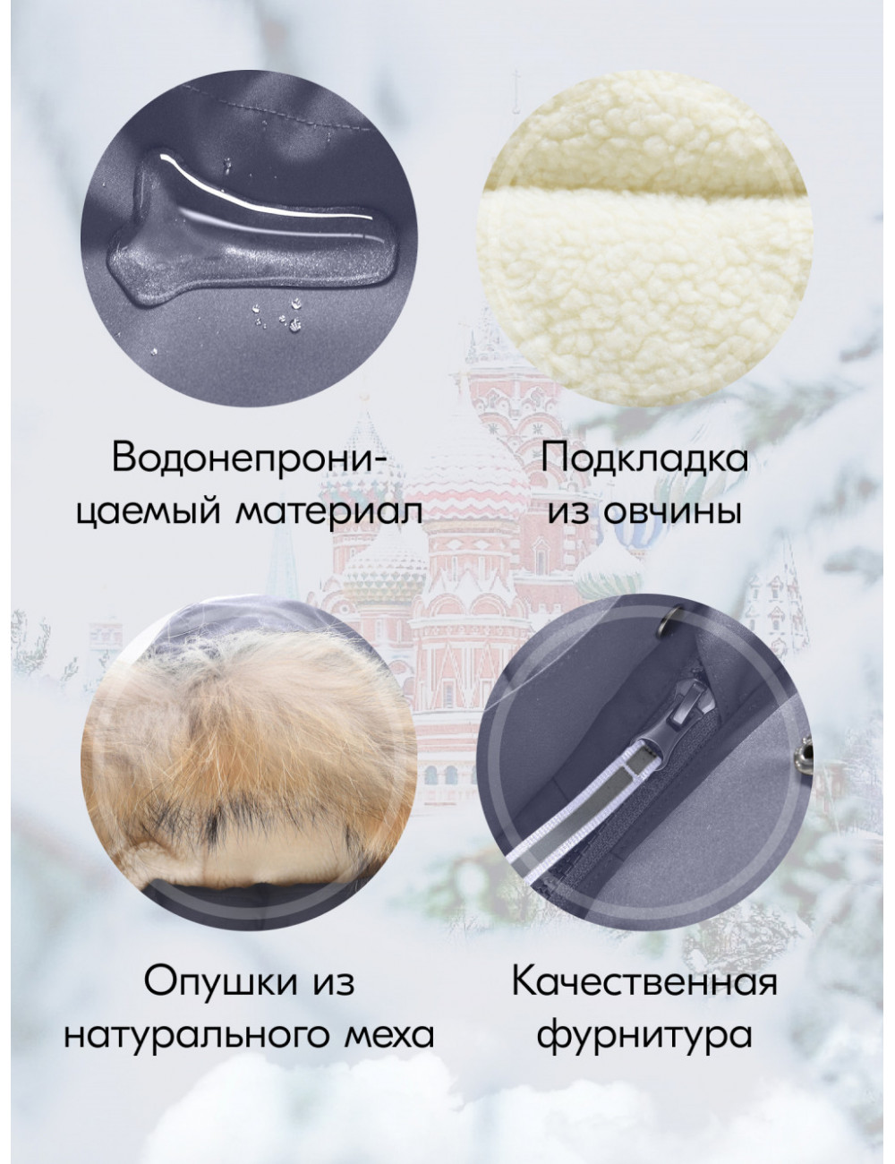 Подкладка из полиэстера и искусственной овчины обеспечивает тепло и комфорт, а также приятные тактильные ощущения. Водонепроницаемость материалов защищает от дождя и снега, сохраняя сухость и тепло.