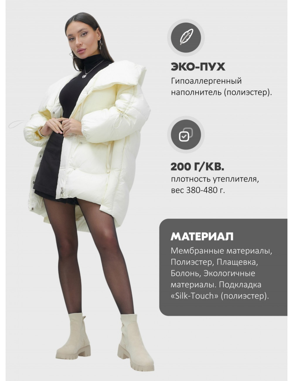 - Гипоаллергенные свойства. Материал пуховика не вызывает аллергии, что делает его подходящим для людей с чувствительной кожей.