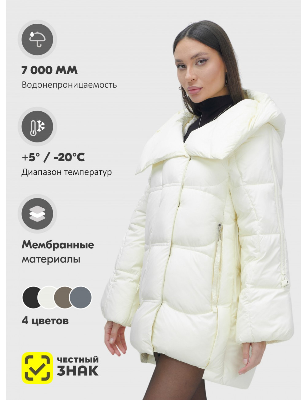 - Качество и долговечность. Пуховик изготовлен из высококачественных мембранных материалов — полиэстера и плащёвки. Это обеспечивает его долговечность и защиту от влаги (водонепроницаемость 7 000 мм).