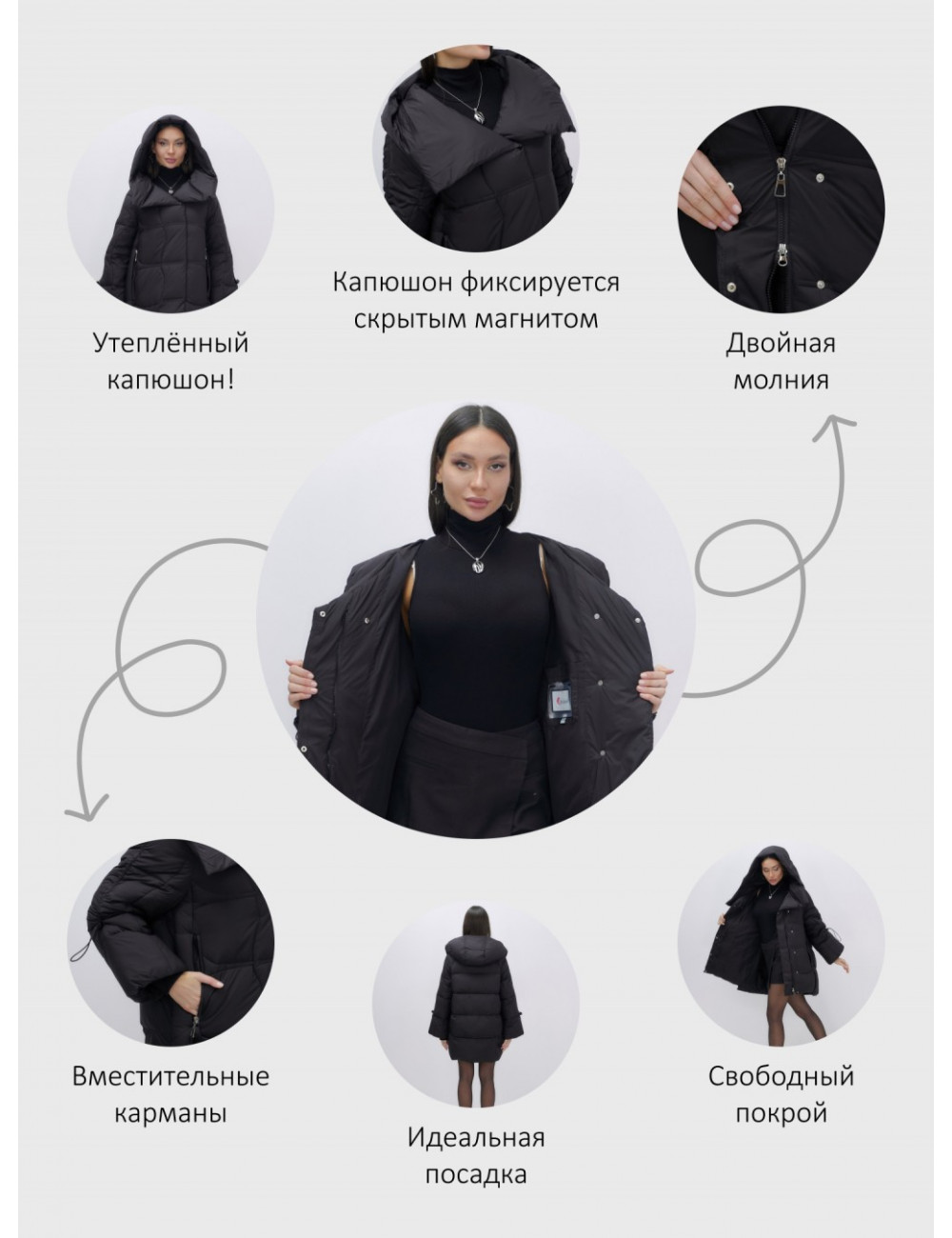 | Декоративные элементы | Капюшон, Карманы, Манжеты, Молния |